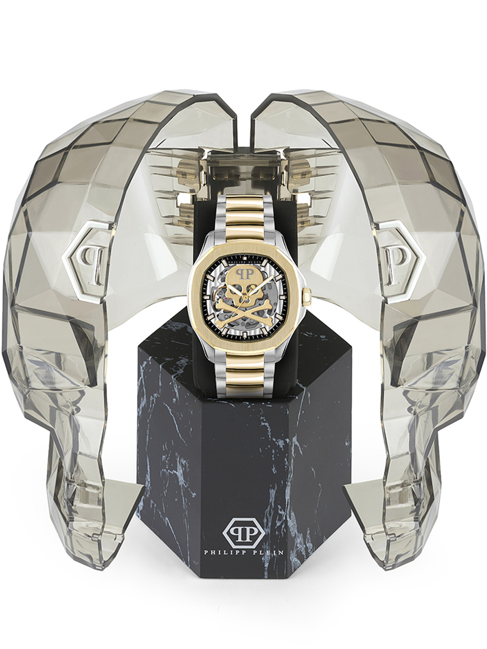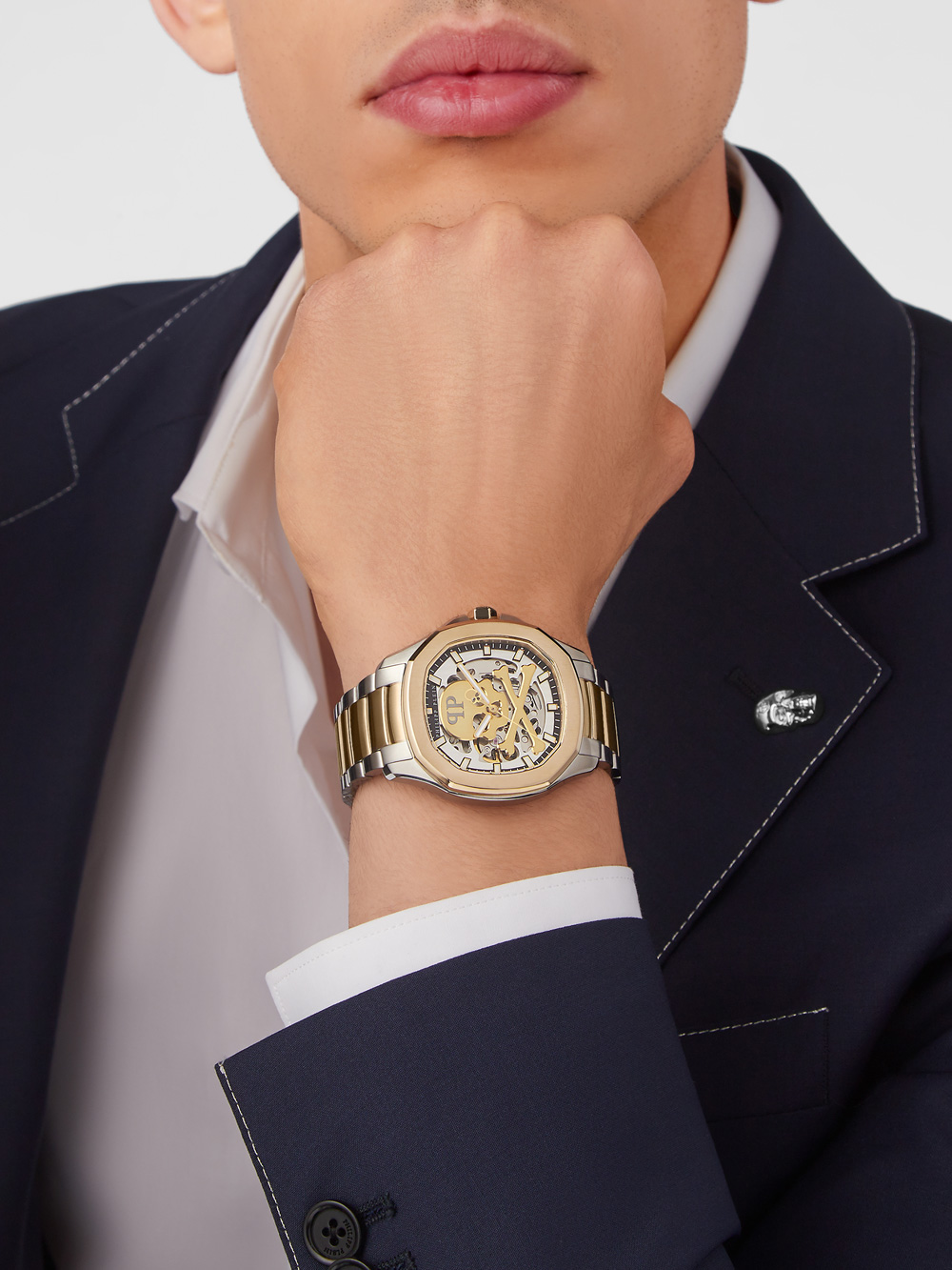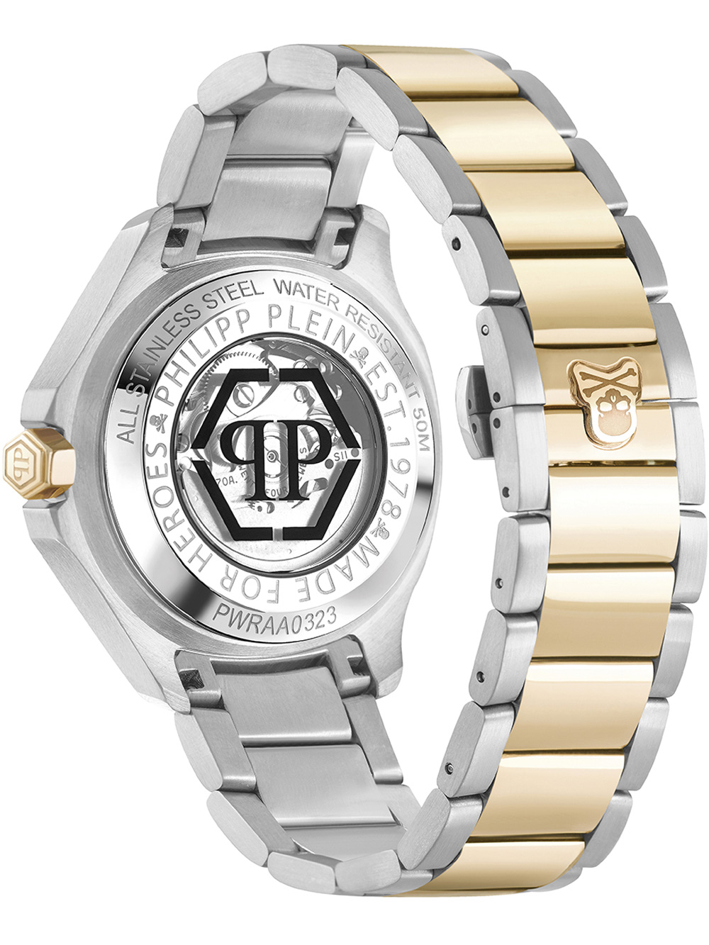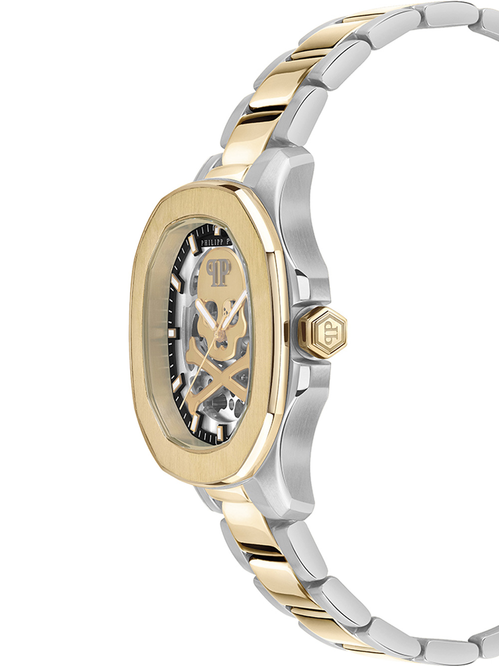 Omschrijving Ontdek de tijd in stijl met dit hoogwaardige automatische herenhorloge van Philipp Plein, met een opvallende gouden en zilveren wijzerplaat en een comfortabele roestvrijstalen band.