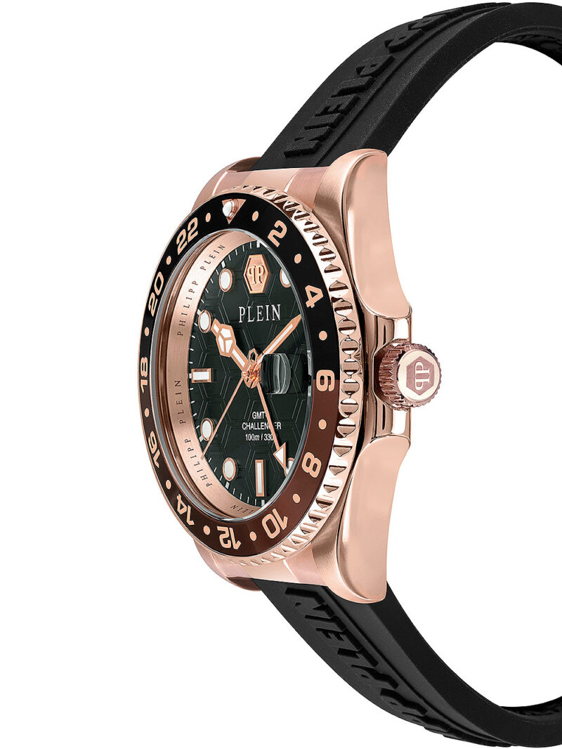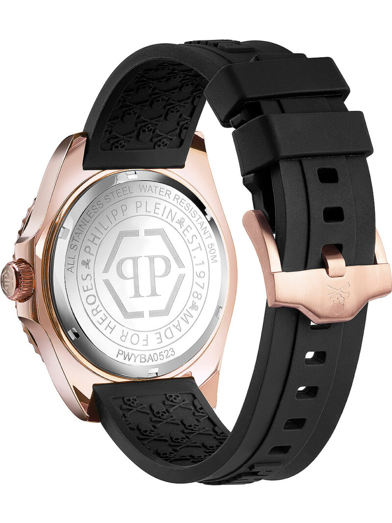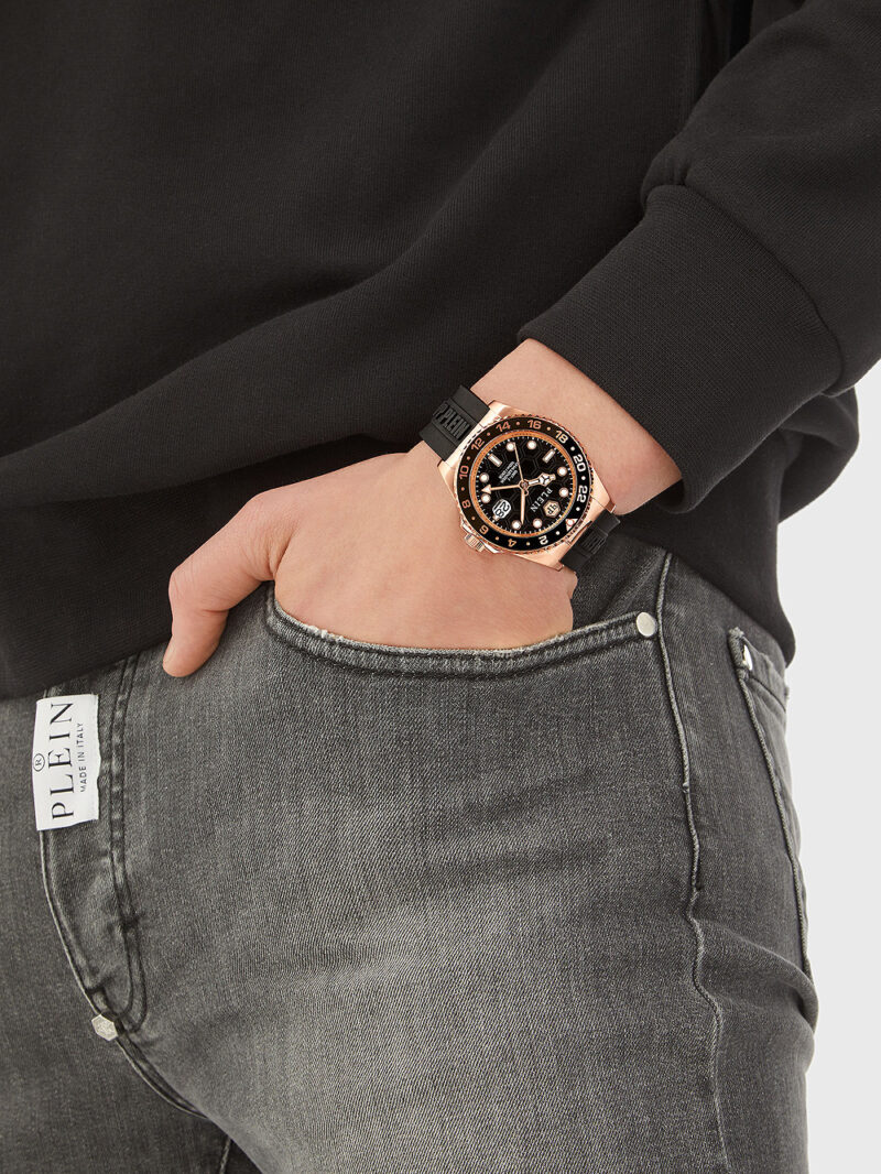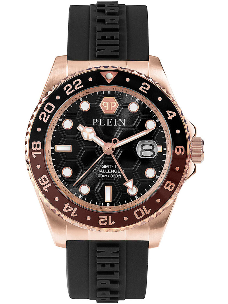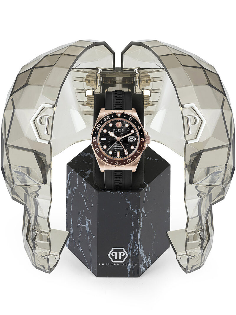 Sportief en stijlvol herenhorloge van Philipp Plein, met een diameter van 44 mm, waterbestendig tot 10 ATM en voorzien van handige functies zoals datum en GMT.