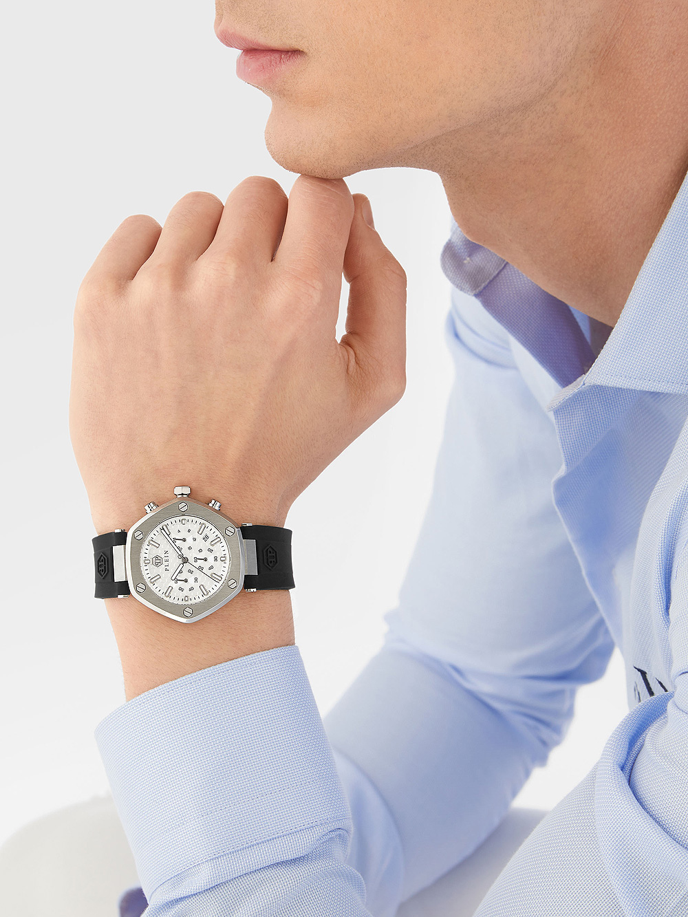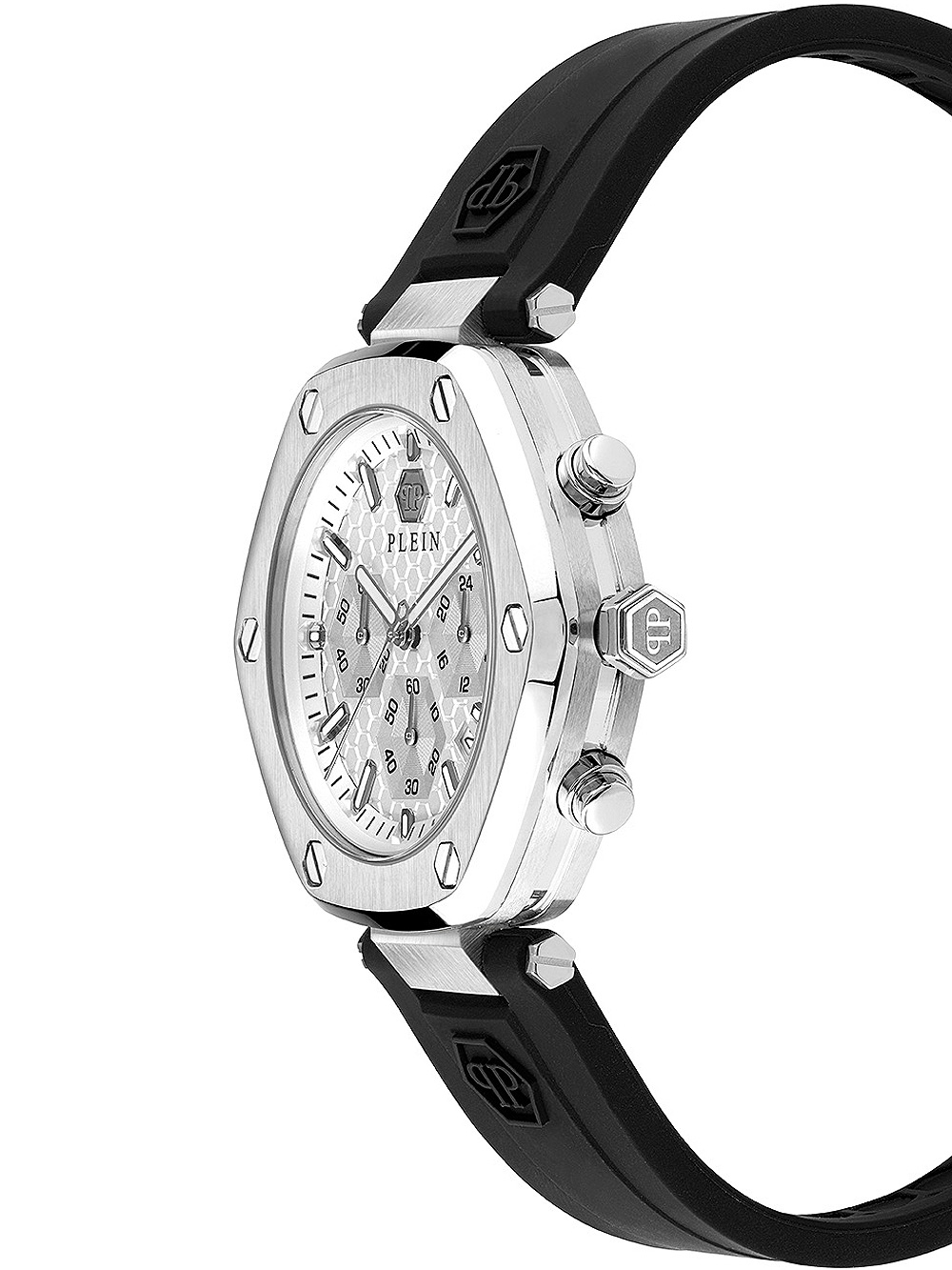 Omschrijving Het exquise zeshoekige chronograaf horloge van Philipp Plein, geschikt voor zowel dames als heren, met een zilveren wijzerplaat, 5ATM waterbestendigheid en een zwarte siliconennn band.