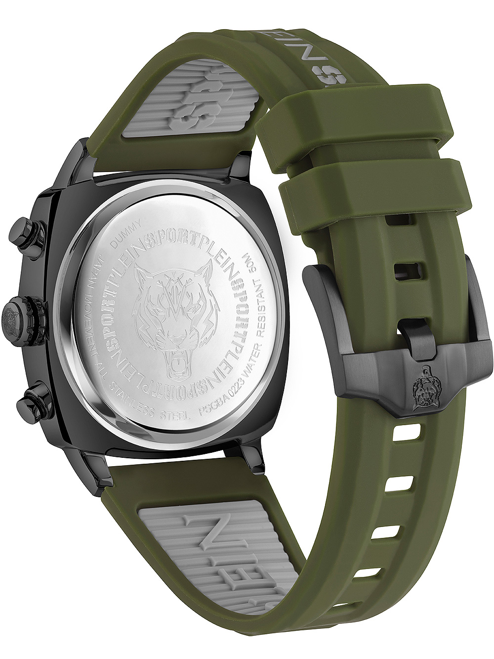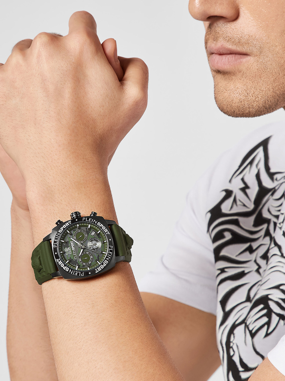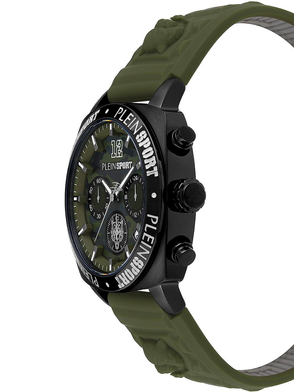 Ontdek de stoere en elegante Wildcat chronograaf herenhorloge van Plein Sport, met camouflage groene wijzerplaat en een waterdichtheid van 5 ATM, voorzien van allerlei handige functies zoals 24-uurs weergave, chronograaf en datum, perfect voor de modebewuste man.