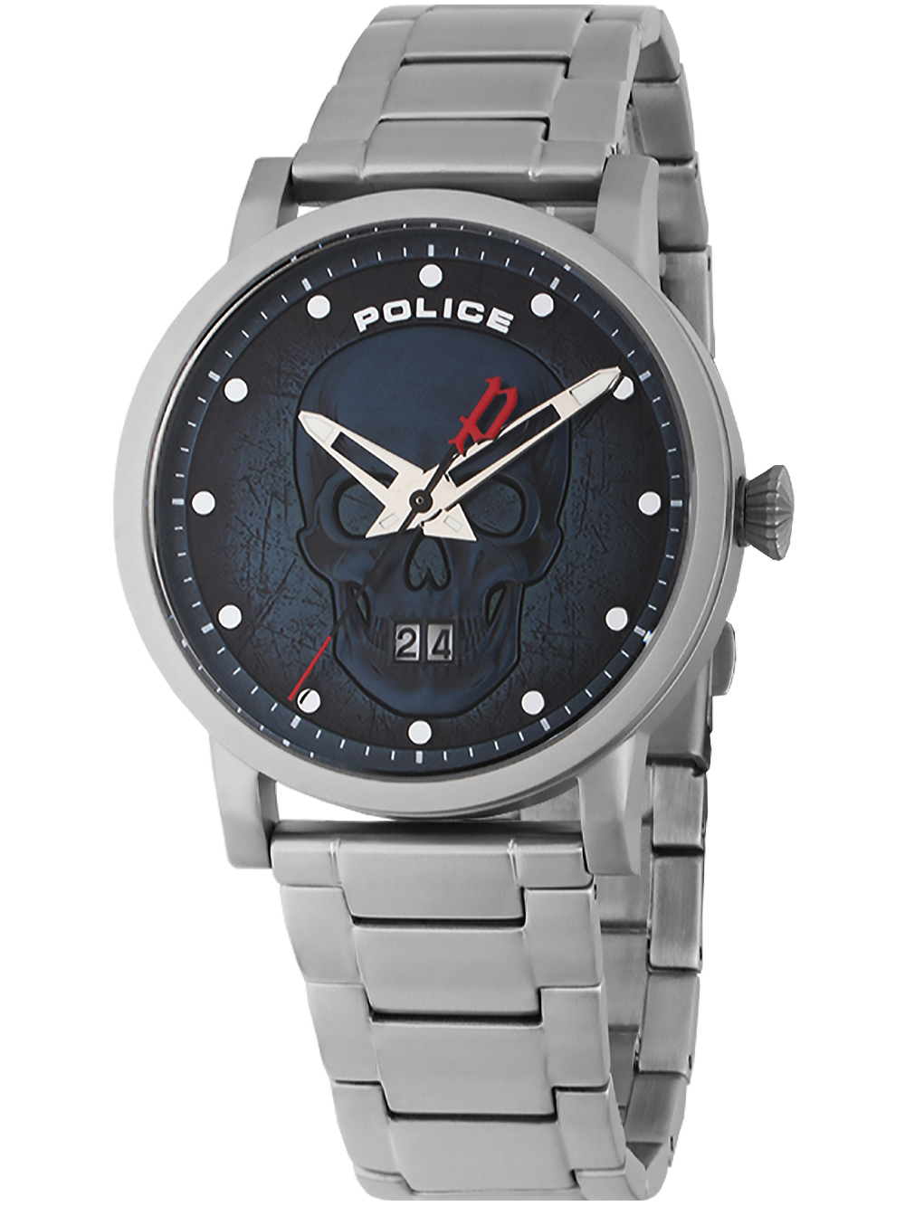 Dit fashionable herenhorloge van Police, model PL15404JS.03MA uit de Collin serie, heeft een blauwe wijzerplaat en een zilveren roestvrijstalen kast van 43 mm met een mat oppervlak, bevat een quartz batterij en is waterbestendig tot 3 ATM.