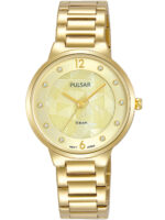 Met dit elegante Pulsar dames polshorloge met een glinsterende Swarovski bezel en een gouden wijzerplaat van mother of pearl ben je altijd bij de tijd en voeg je een vleugje glamour toe aan elke outfit.