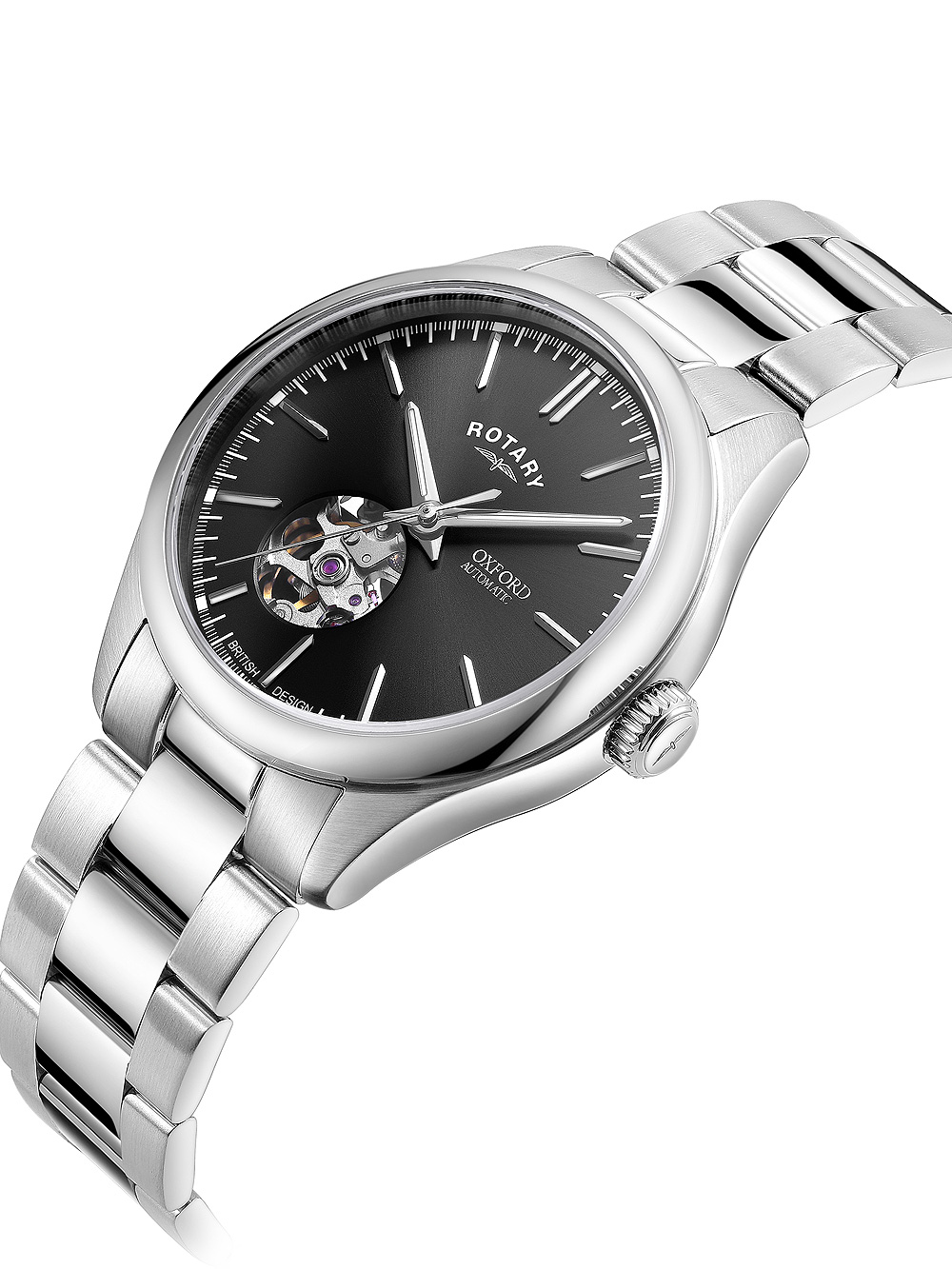 Dit imposante herenhorloge van Rotary uit de OXFORD serie heeft een automatische beweging en een zilveren roestvrijstalen kast met een diameter van 40 mm, een zwarte wijzerplaat en een waterbestendigheid van 5 ATM.