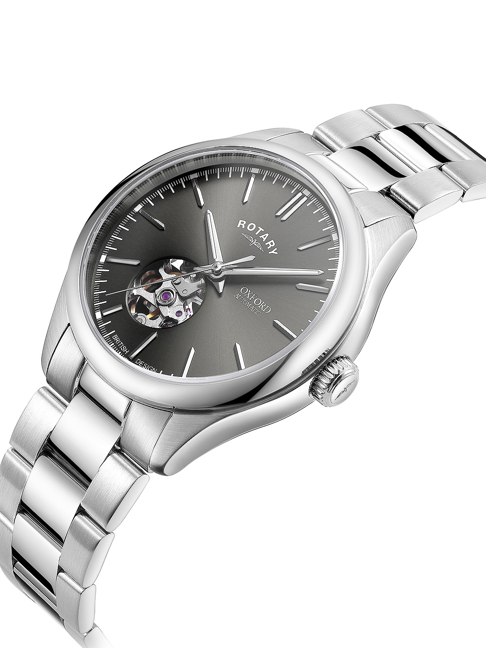 Het Rotary GB05095/74 Oxford automatisch herenhorloge is een stijlvol en klassiek polshorloge met een diameter van 40 mm, waterdicht tot 5ATM en voorzien van een automatisch uurwerk, grijze wijzerplaat en zilveren roestvrijstalen band met vlindersluiting.