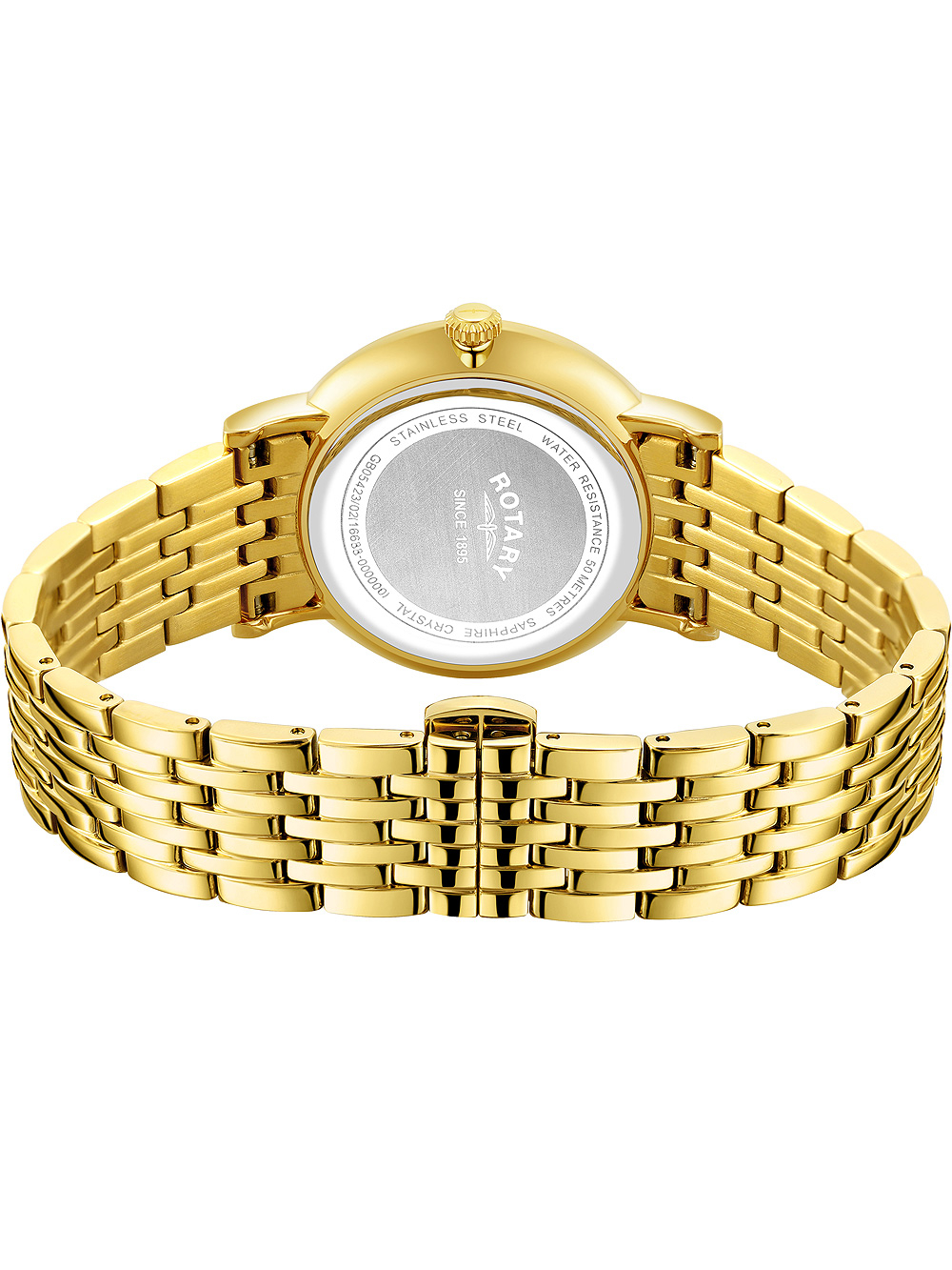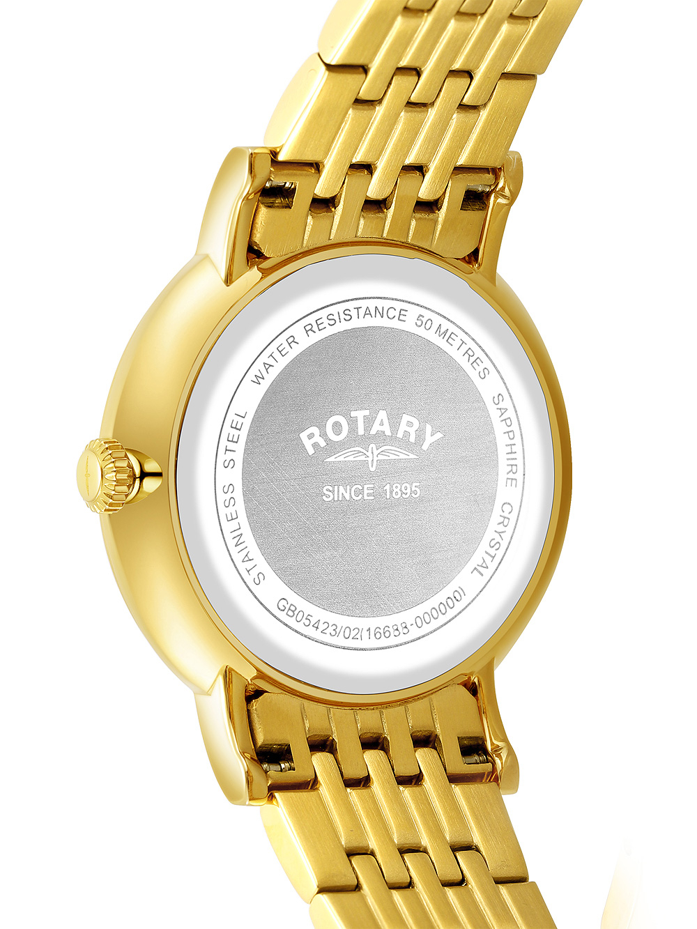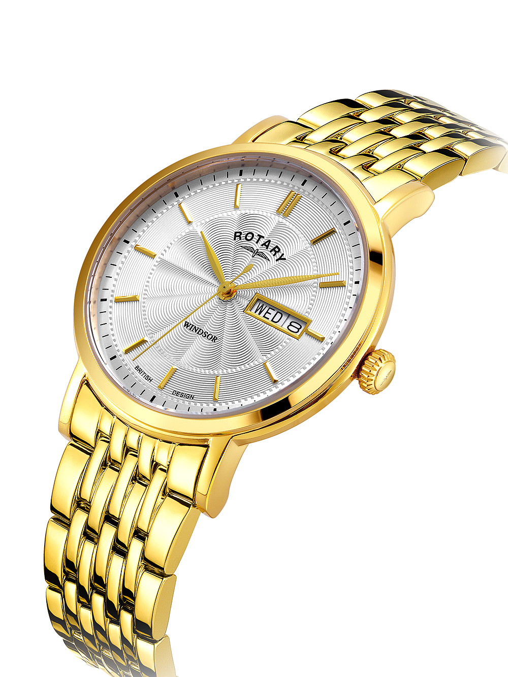 Omschrijving Dit imposante herenhorloge van Rotary, model Windsor GB05423/02, heeft een gouden kast en band, een zilveren wijzerplaat en is waterbestendig tot 5 ATM.