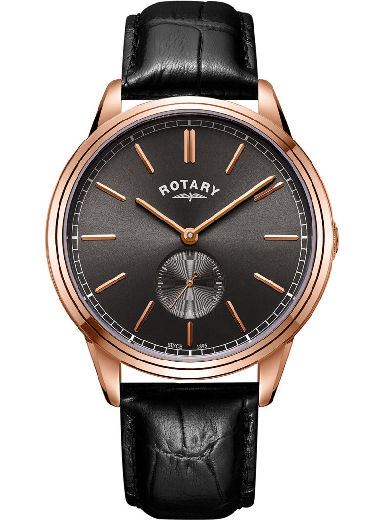 Het klassieke en moderne herenpolshorloge van Rotary, model GS05364/20 uit de Cambridge serie, heeft een zwarte wijzerplaat en rosé gouden kast, is waterbestendig tot 5 ATM en wordt geleverd met een roestvrijstalen band, perfect voor de hedendaagse man.