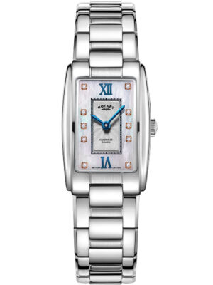 Laat je betoveren door de elegantie van dit ultraslanke dameshorloge van Rotary, met een roségouden en zilveren kast, moeder-van-pareldial en diamanten accenten, waterbestendig tot 5ATM en voorzien van een anti-reflecterend saffierglas.