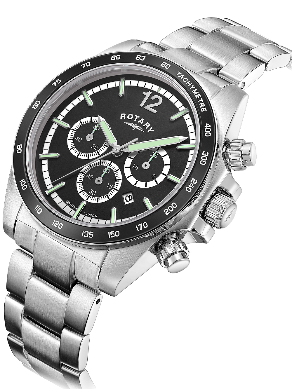 Omschrijving Dit sportieve heren polshorloge van Rotary, model Henley Chronograaf 41mm, heeft een roterende bezel en een zwarte wijzerplaat met illuminerende wijzers en indexen, en is waterbestendig tot 10 ATM.