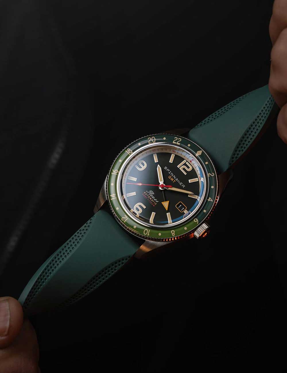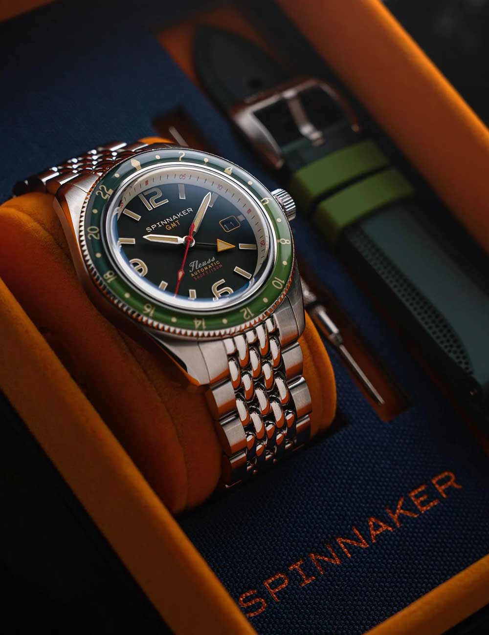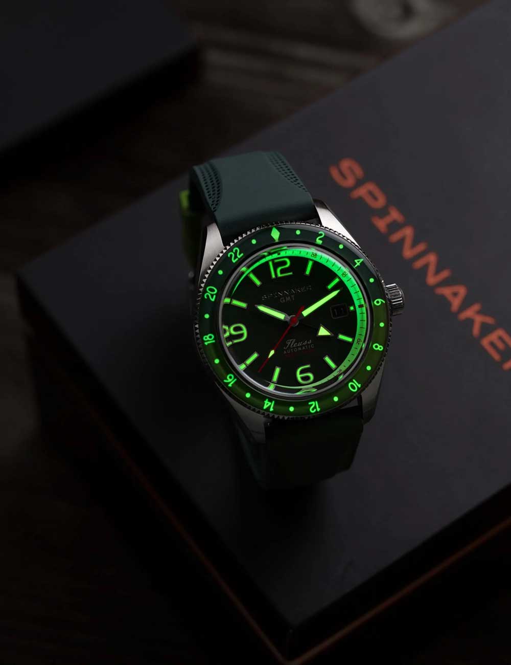 Ontdek de perfecte combinatie van functionaliteit en stijl met het Spinnaker SP-5120-44 herenhorloge Fleuss GMT automatische set, met een stoere groene wijzerplaat, 2 tijdzones en een waterbestendigheid van 15 ATM.