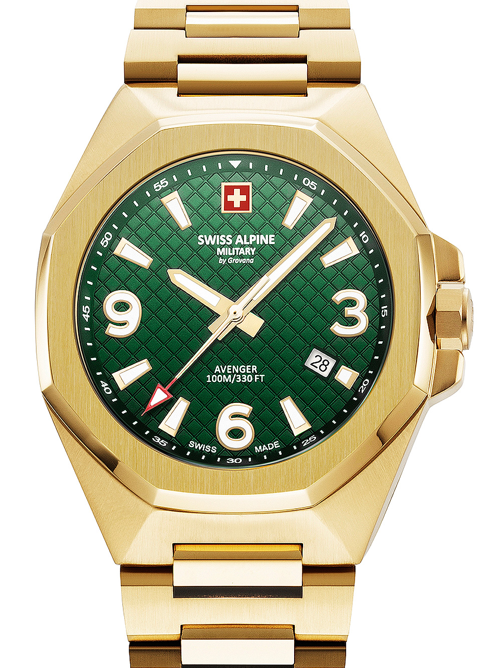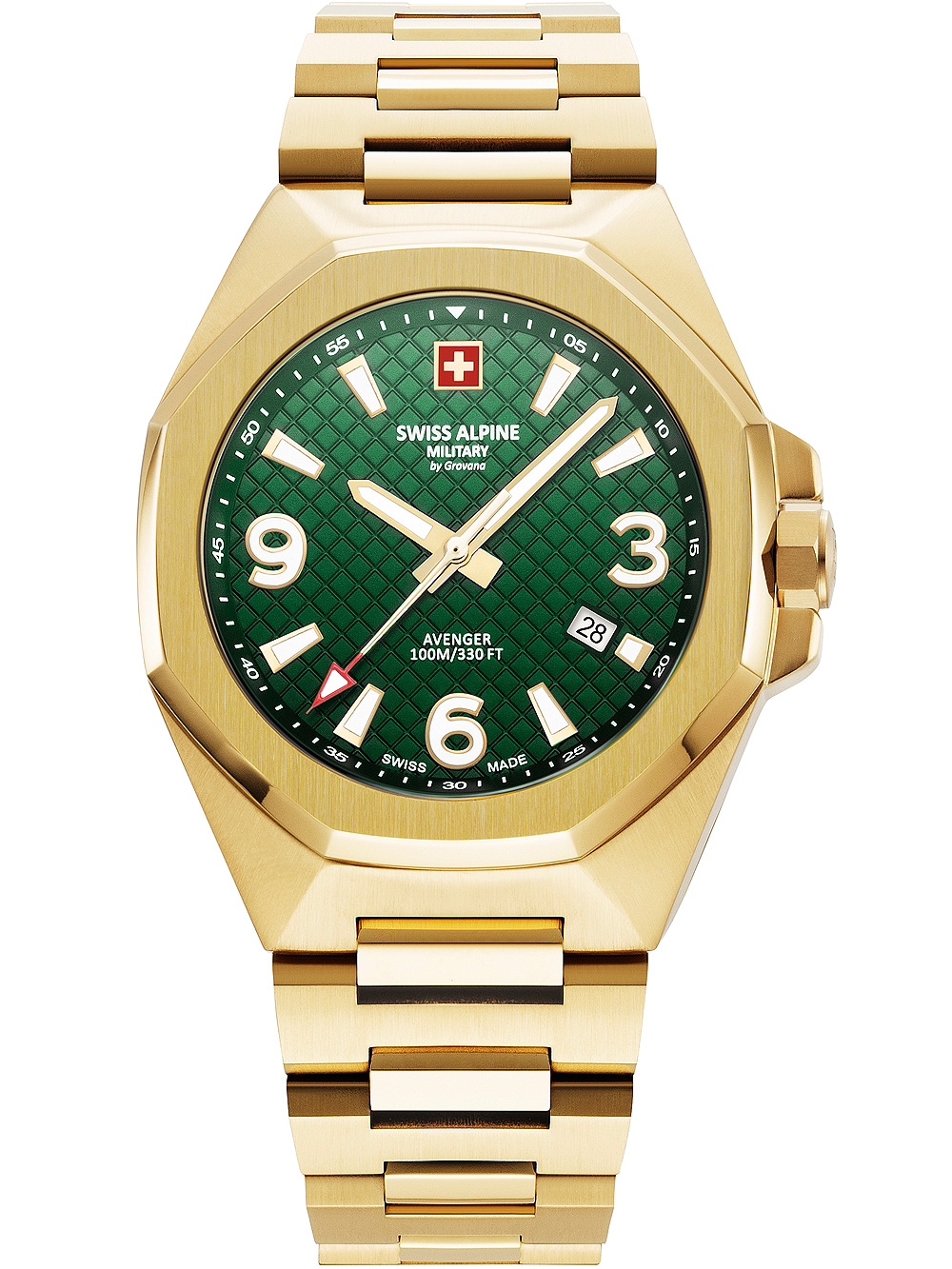 Omschrijving Het Swiss Alpine Military 7005.1114 Typhoon herenhorloge is een sportief en stijlvol polshorloge met een groene wijzerplaat, gouden kast en een waterdichtheid tot 10 ATM.