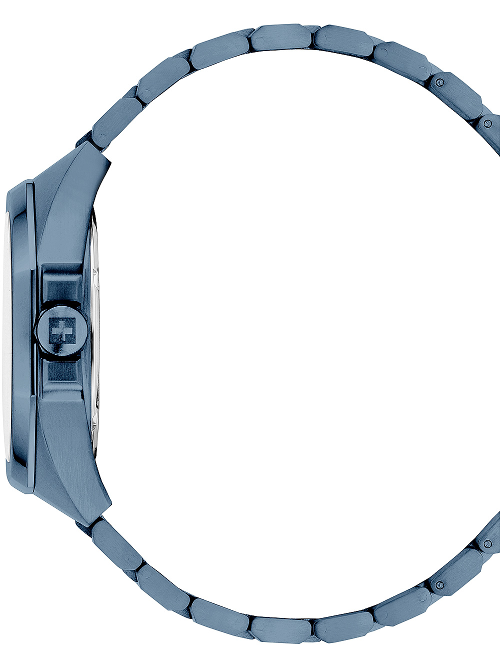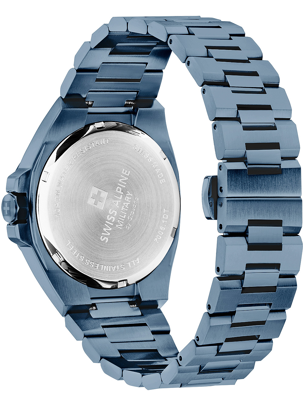 Het Swiss Alpine Military 7005.1195 Typhoon herenhorloge is een sportief polshorloge met een blauwe wijzerplaat, dat waterbestendig is tot 10 ATM en beschikt over een datum-, uur-, minuut- en secondeweergave.