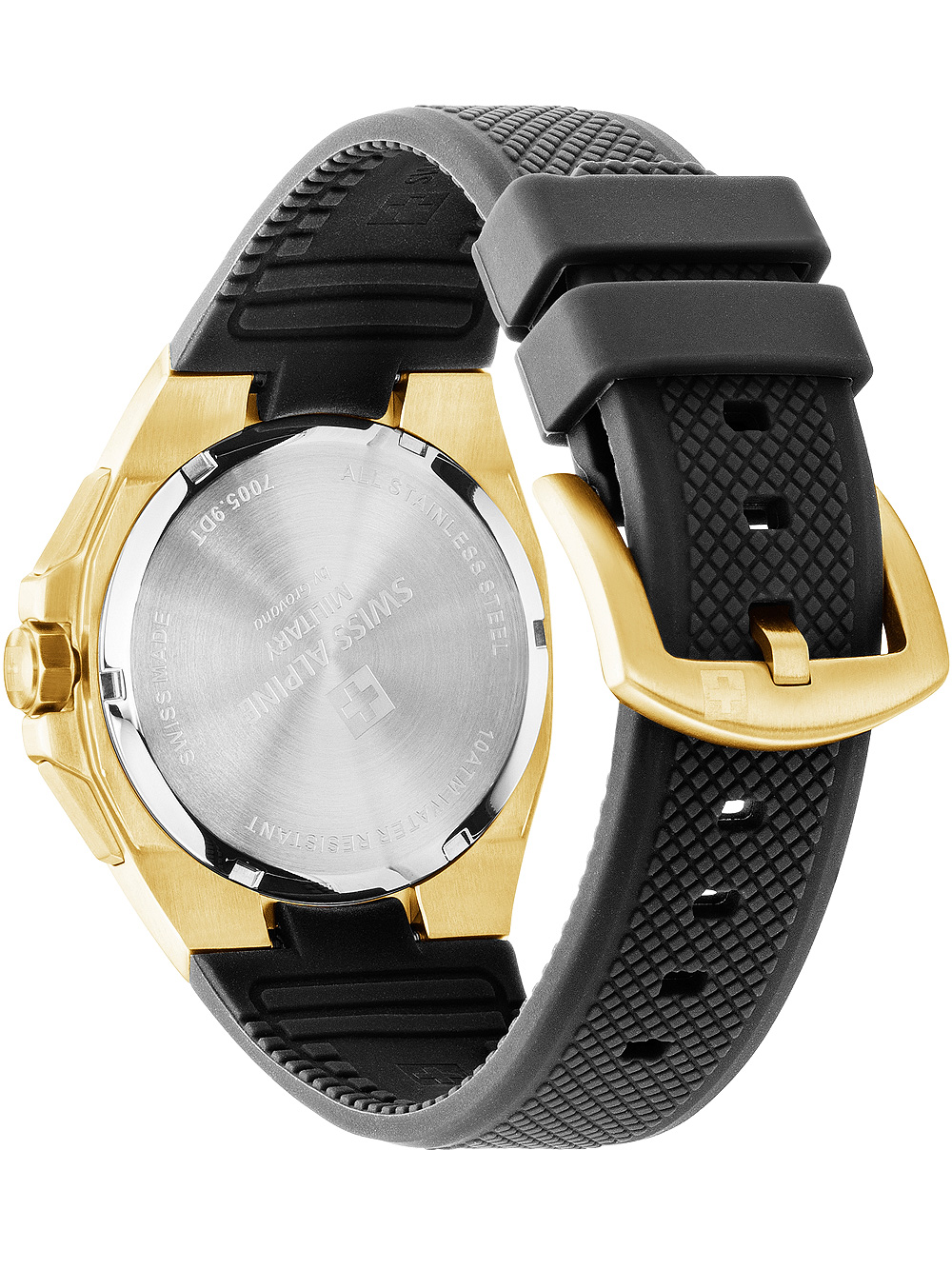Dit Swiss Alpine Military 7005.9817 Typhoon chronograaf herenhorloge heeft een modebewuste zwarte wijzerplaat met gouden accenten en is waterbestendig tot 10 ATM, perfect voor de sportieve man die op zoek is naar een kwalitatief hoogwaardig horloge.