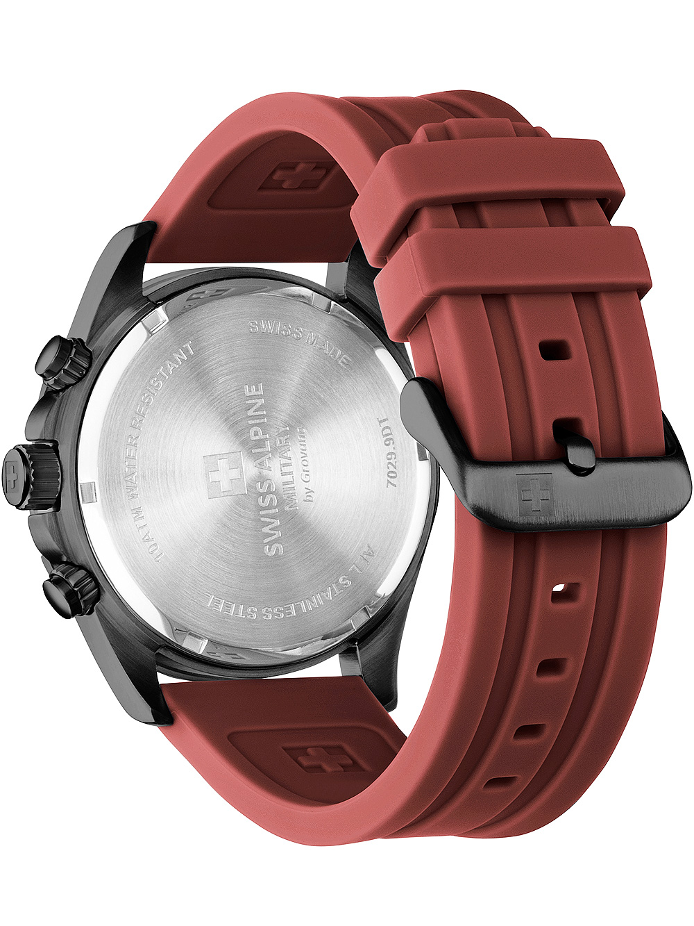 Omschrijving Met het Swiss Alpine Military 7029.9876 Raptor chronograaf herenhorloge in matzwart en rood, voorzien van een Swiss-Made batterij en gehard mineraalglas, ben je altijd op tijd én stijlvol.