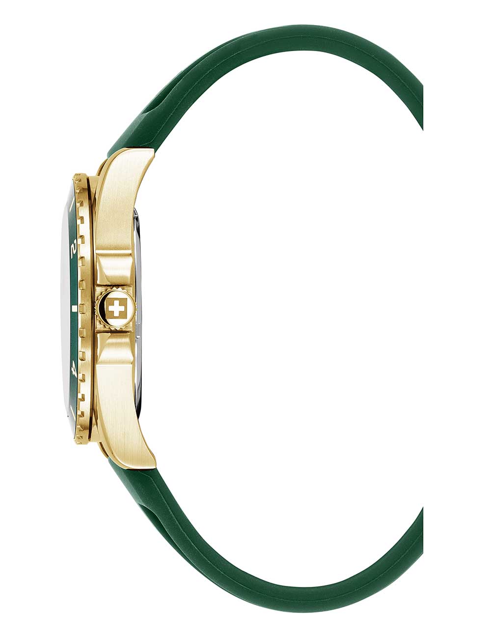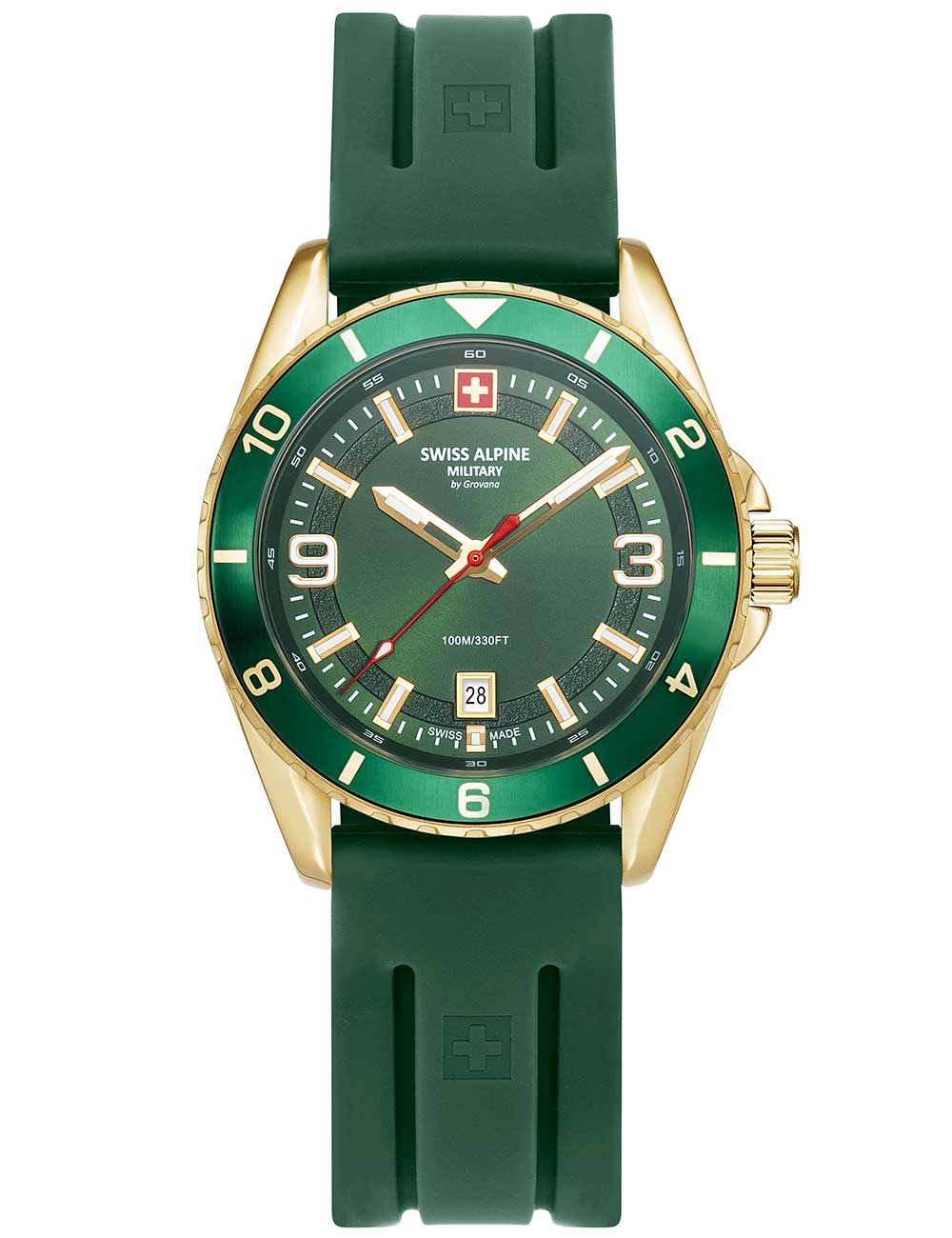 Het Swiss Alpine Military 7034.1814 herenhorloge Sierra is een stijlvol en sportief polshorloge met een gouden kast en groene wijzerplaat, voorzien van een quartz uurwerk en handige functies zoals datumweergave en verlichte wijzers en indexen.