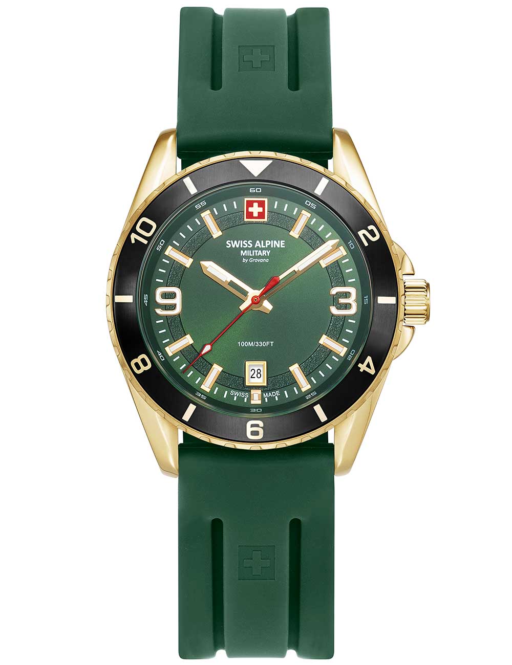 Ontdek de perfecte combinatie van stijl en functionaliteit met het Swiss Alpine Military 7034.1818 herenhorloge Sierra in goud en groen, voorzien van een batterij (quartz) uurwerk, datumweergave en waterbestendigheid tot 10ATM.
