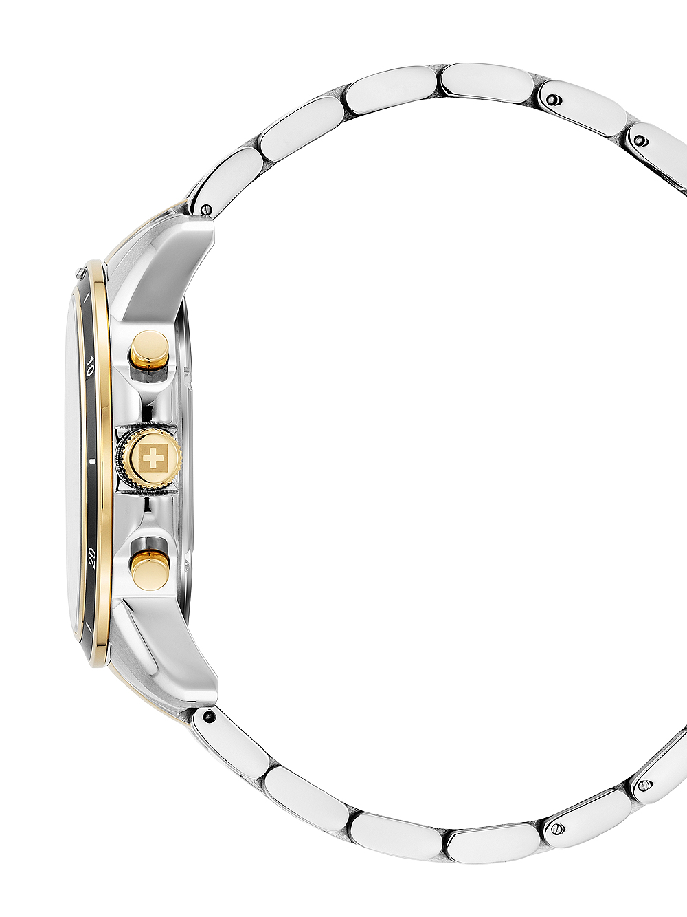 Omschrijving Het Swiss Alpine Military 7089.9147 chronograaf herenhorloge is een stijlvol, modern en sportief polshorloge van 44 mm met een zwarte wijzerplaat, gouden en zilveren accenten en een waterbestendigheid van 10 ATM.