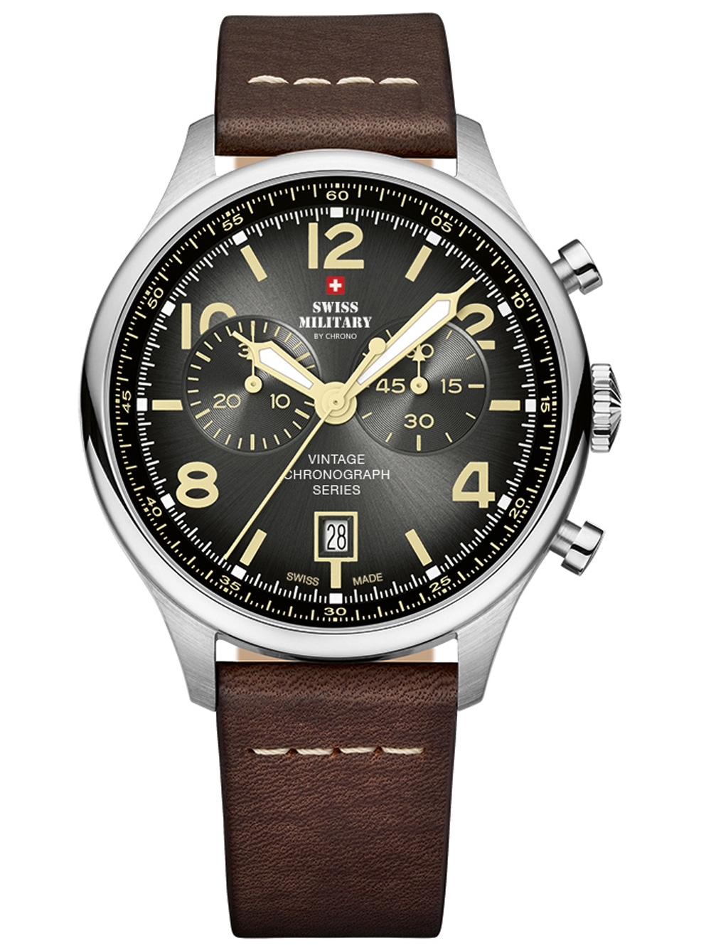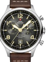 Omschrijving Met dit stoere en sportieve Swiss Military polshorloge, voorzien van een 42 mm grijze wijzerplaat, chronograaf, datumfunctie en waterbestendigheid tot 10 ATM, ben je altijd op tijd én stijlvol.
