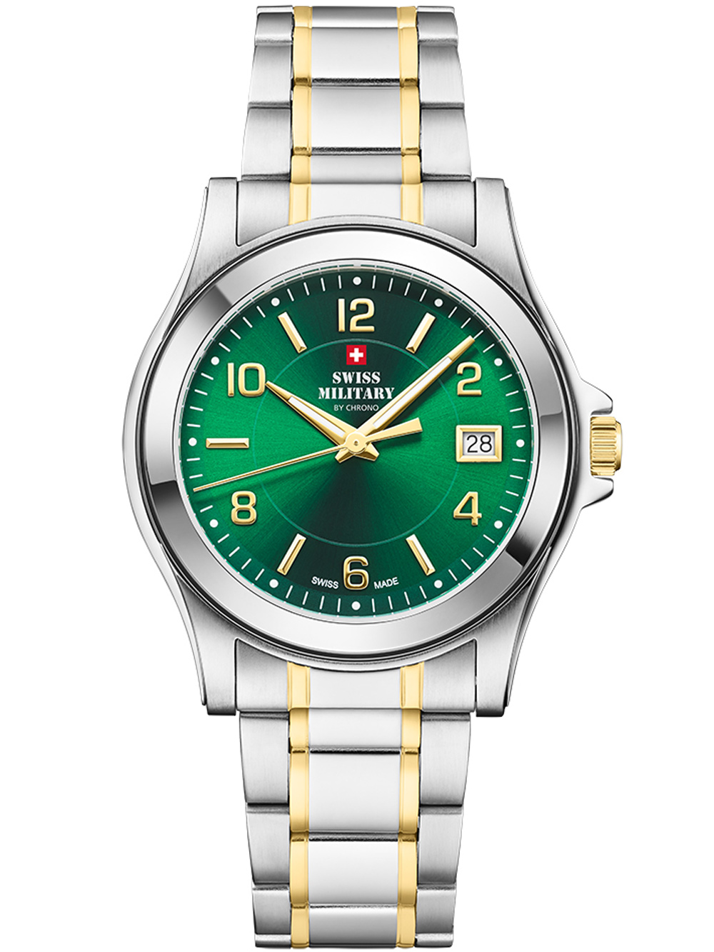 Omschrijving Ontdek de tijdloze elegantie van dit Swiss Military herenhorloge (39 mm) met groene wijzerplaat, matted en polished afwerking, waterbestendig tot 5 ATM en voorzien van datum-, uur-, minuut- en secondeweergave.