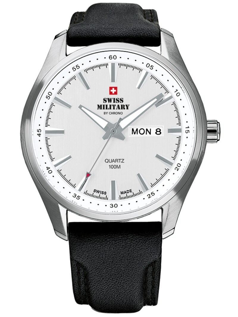 Met dit trendy en robuuste Swiss Military heren polshorloge, voorzien van een zilveren kast en zwarte leren band, ben je altijd bij de tijd en klaar voor elke missie.