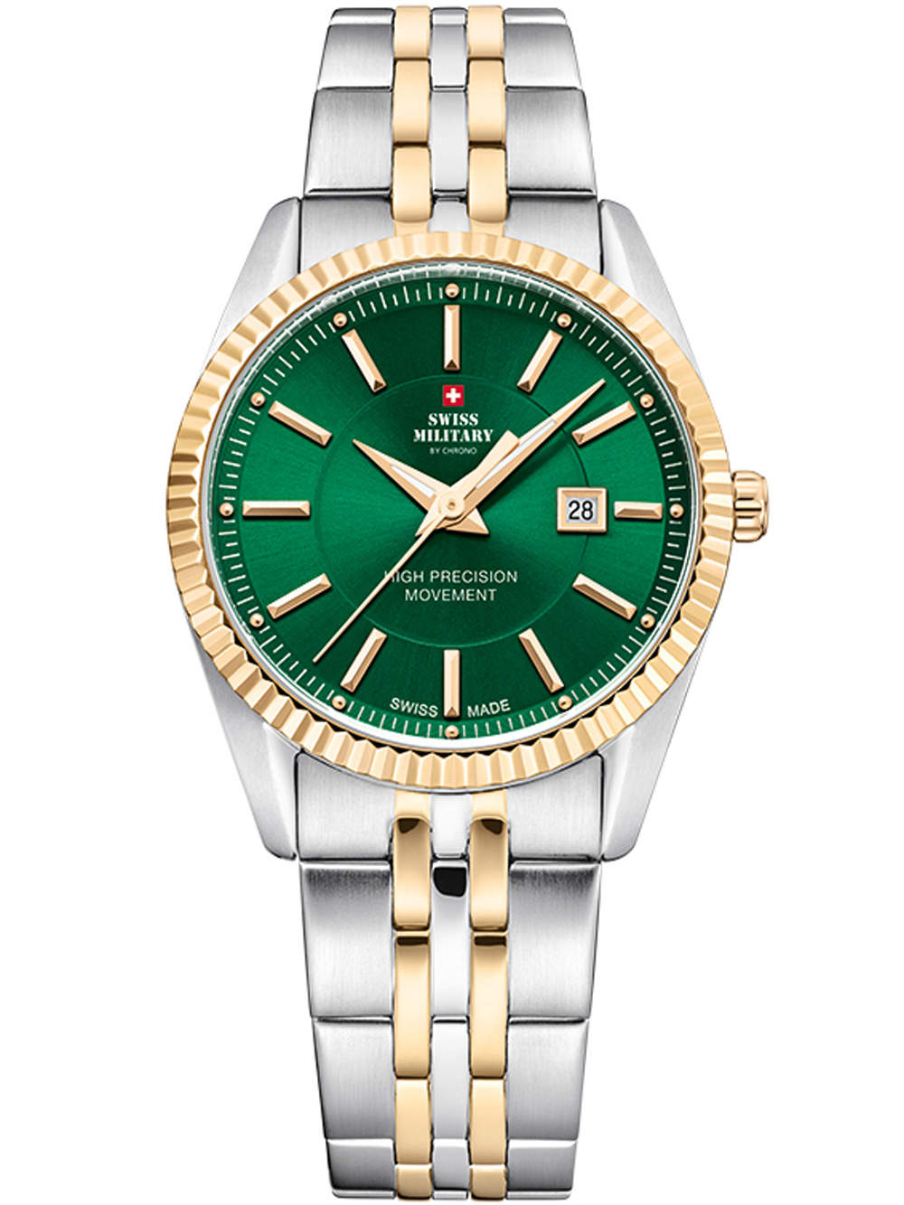 Omschrijving Met dit tijdloze en betrouwbare Swiss Military dameshorloge van Swiss Military, met een groene wijzerplaat en een diameter van 30 mm, ben je altijd op tijd én in stijl.