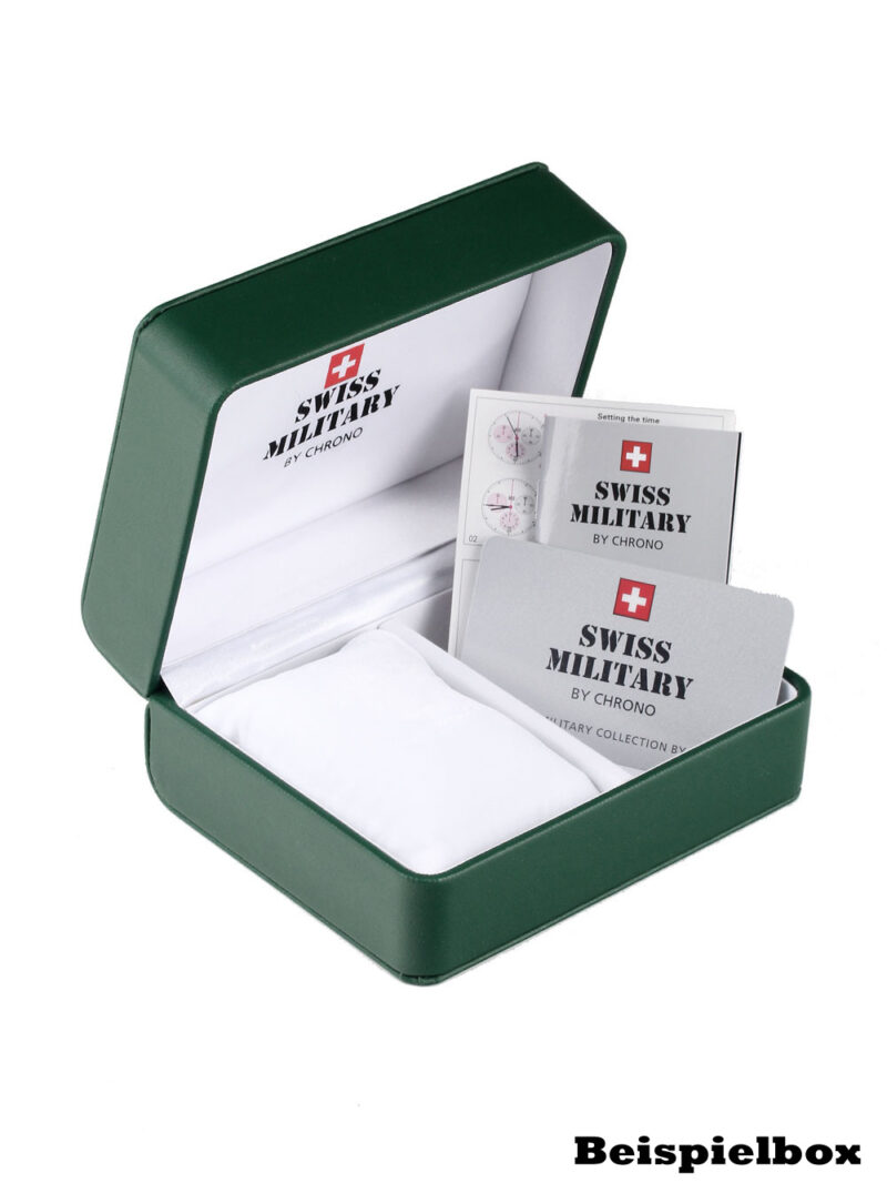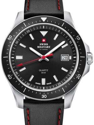 Dit tijdloze Swiss Military heren polshorloge, met een diameter van 42 mm en een waterbestendigheid van 5 ATM, heeft een grijze wijzerplaat en een leren band in zwart en grijs.