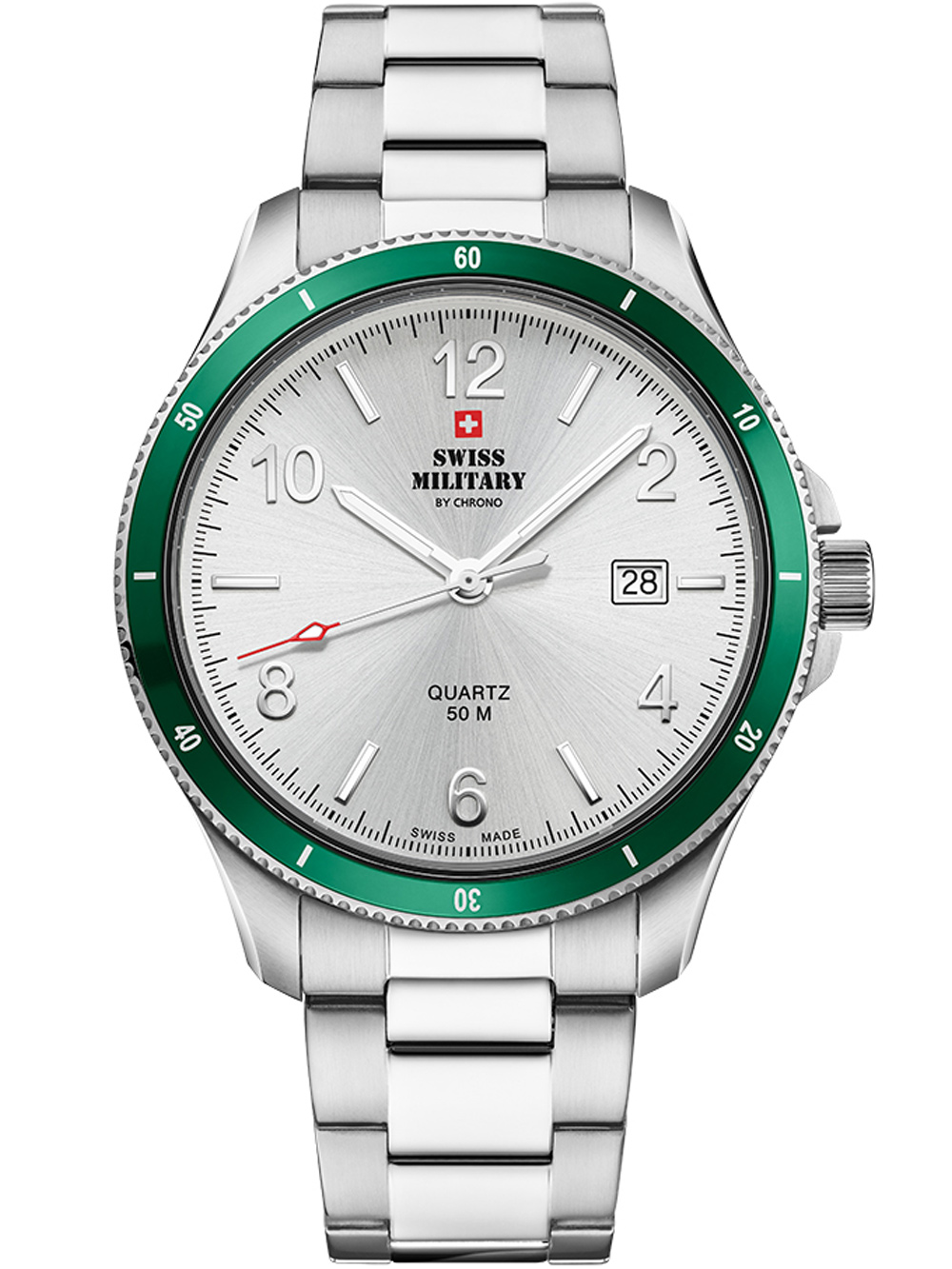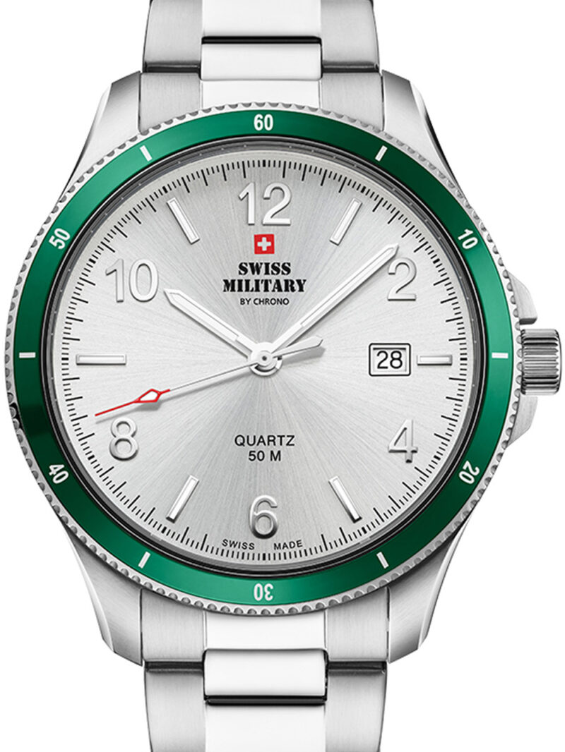 Omschrijving Dit elegante herenhorloge van Swiss Military is gemaakt van hoogwaardig roestvrij staal en heeft een witte wijzerplaat, een groene en zilveren kast en een 42 mm diameter, met functies zoals datum, uur, minuut en seconde, waterbestendigheid van 5 ATM en een klassieke uitstraling.