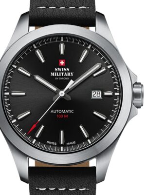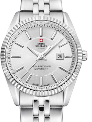 Dit Swiss Military polshorloge van Swiss Military, model SMP36040.23, is een klassiek herenhorloge met een witte wijzerplaat, 5ATM waterbestendigheid en een zilveren roestvrijstalen kast en band.