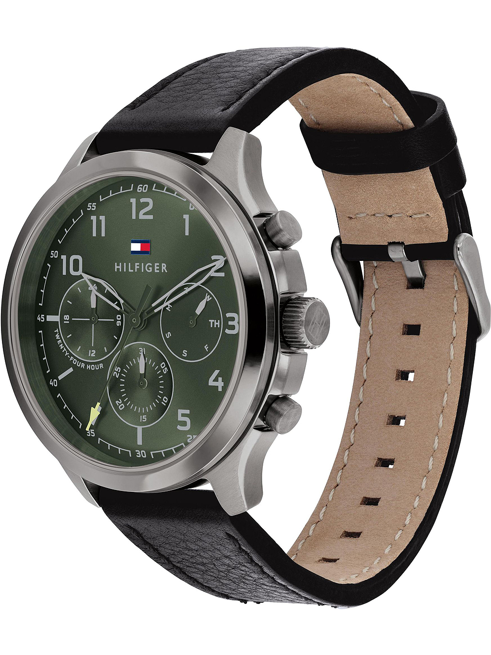 Het Tommy Hilfiger 1791856 Asher herenhorloge is een glamoureuze en sportieve accessoire met een groene wijzerplaat, een stevig roestvrijstalen kast en een comfortabele zwarte leren band, ideaal voor mannen die op zoek zijn naar een kwalitatief hoogwaardig horloge met een modern design.