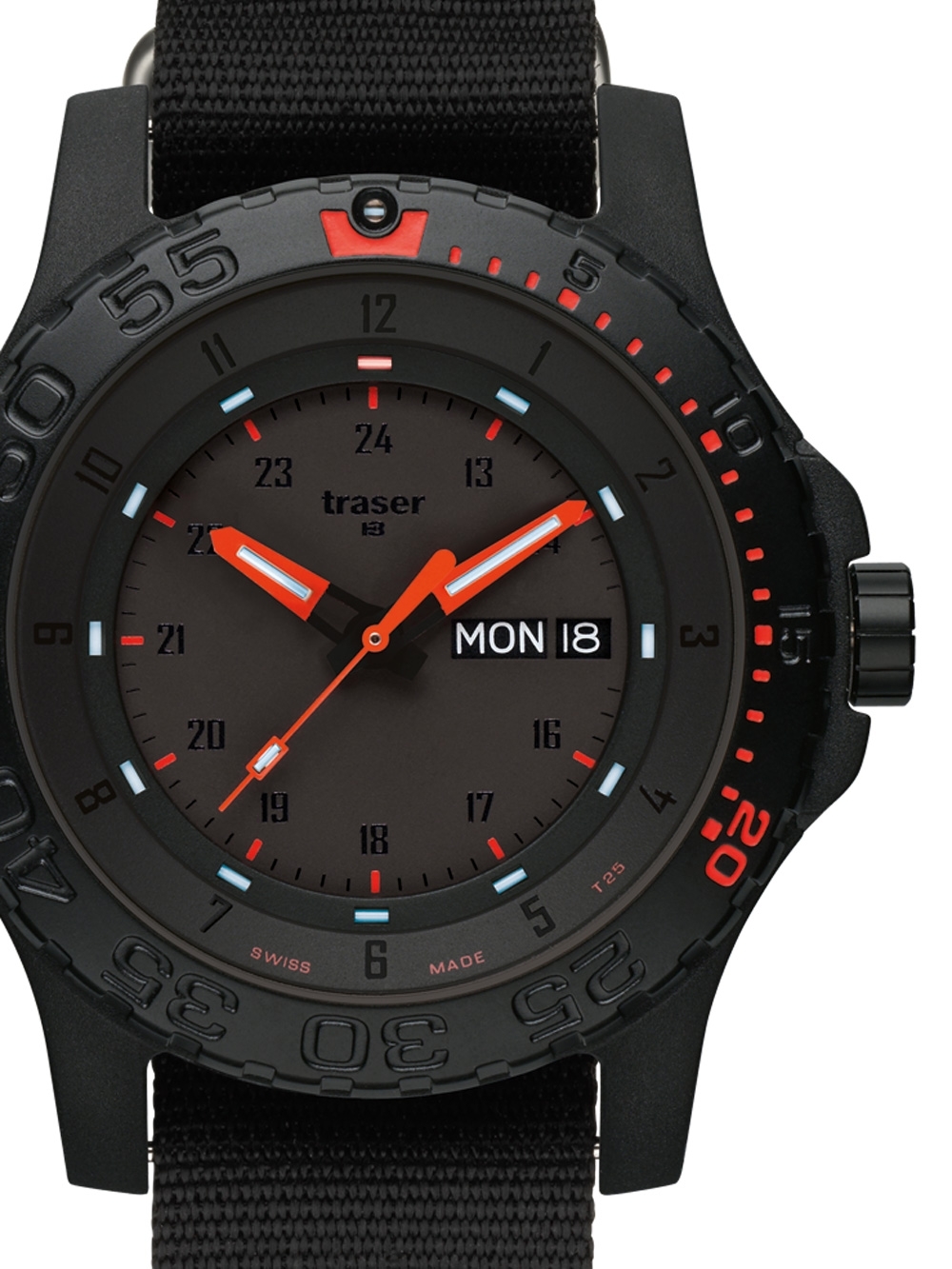 Specificaties Oppervlakteafwerking: MatSerie: P66 Rood CombatSluiting: GespsluitingAanzetbreedte – Lugbreedte van Horlogeband (mm): 25Tijdfuncties: Datum, Dag, Uur, Minuut, SecondeennnnnnnnBezel: Bidirectioneel,DraaibaarKleur van Horlogekast: ZwartMateriaal Horlogekast: Roestvrij staalDikte Horlogekast (mm): 12Breedte van Horlogekast (mm): 45Achterkant Horlogekast: geschroefd, Roestvrij staal achterkantKleur Wijzerplaat : ZwartWijzerplaatweergave: AnaloogDoelgroep: HerenHorlogeglas: Anti-reflecterend, SaffierglasVerlichting Horloge: Verlichte wijzers en indexen, trigalight®, TritiumType Uurwerk: Batterij (quartz)Soort Sluiting: GespsluitingKleur Horlogeband: ZwartHorlogeband: TextileStijl Horloge: SportyWaterbestendigheid (ATM): 20Maximale Polsomtrek (mm): 240Inclusief: Horlogedoos, handleiding en garantiebewijs