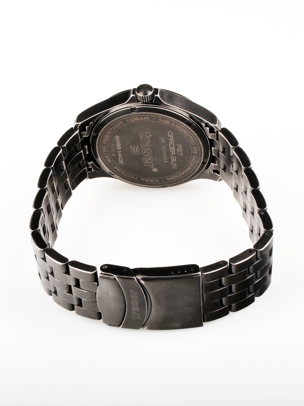Dit stijlvolle polshorloge van Traser H3, model Officer Pro-pistool, is waterbestendig tot 10 ATM en heeft een diameter van 42 mm.