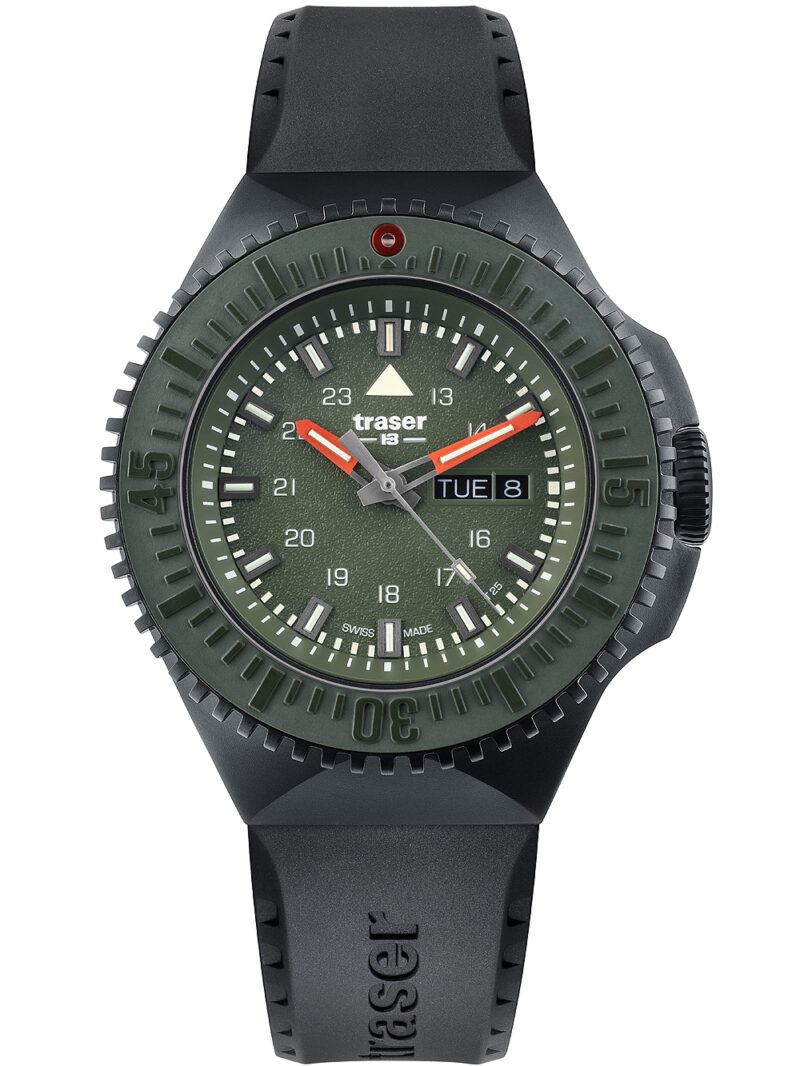 Omschrijving Ga voor een stoere en sportieve look met het Traser H3 109859 P69 polshorloge, uitgerust met een groene wijzerplaat en bidirectionele bezel, waterdicht tot 20 ATM en voorzien van handige functies zoals datum- en tijdweergave.
