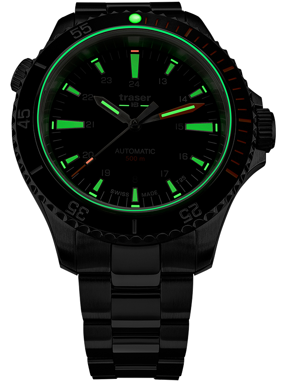 Ontdek de kracht van de Traser H3 110321 P67 Duiker automatisch zwart speciale set herenhorloge met een diameter van 46 mm en waterbestendigheid tot 50ATM, voorzien van een Swiss Made automatisch uurwerk en uitgerust met handige functies zoals datumweergave en verlichte wijzers en indexen dankzij de trigalight® en Tritium technologie, inclusief een extra rubberen band en verpakt in een luxe doos met instructies en garantiedocumenten.