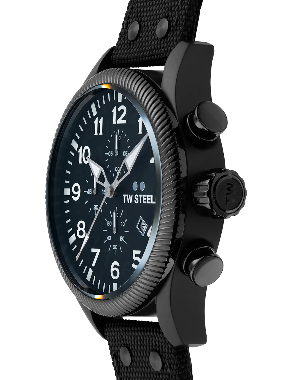 Omschrijving Stijlvol en sportief herenhorloge van TW-Steel, de VS113 Volante chronograaf met een zwarte wijzerplaat, 48 mm kast, waterdicht tot 10 ATM en een batterij aangedreven Seiko VD57 uurwerk.