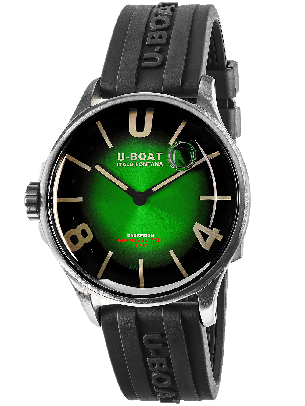 Het U-Boat 9502/A Darkmoongroen SS Soleil herenhorloge is een modern polshorloge met een groene wijzerplaat, zilveren kast en zwarte caoutchouc band, voorzien van een Swiss Made Ronda quartz uurwerk, anti-reflecterend saffierglas en een waterbestendigheid van 5 ATM.