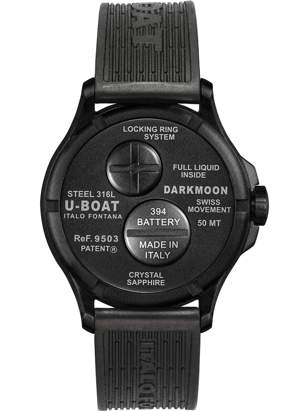 Het U-Boat 9503 donkermoongroen PVD Soleil herenhorloge met een diameter van 40 mm is een modern en sportief polshorloge met een groene wijzerplaat, mat zwarte kast en rubberen band, uitgerust met een batterij (quartz) uurwerk en Swiss made Ronda 762 beweging.
