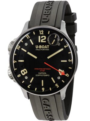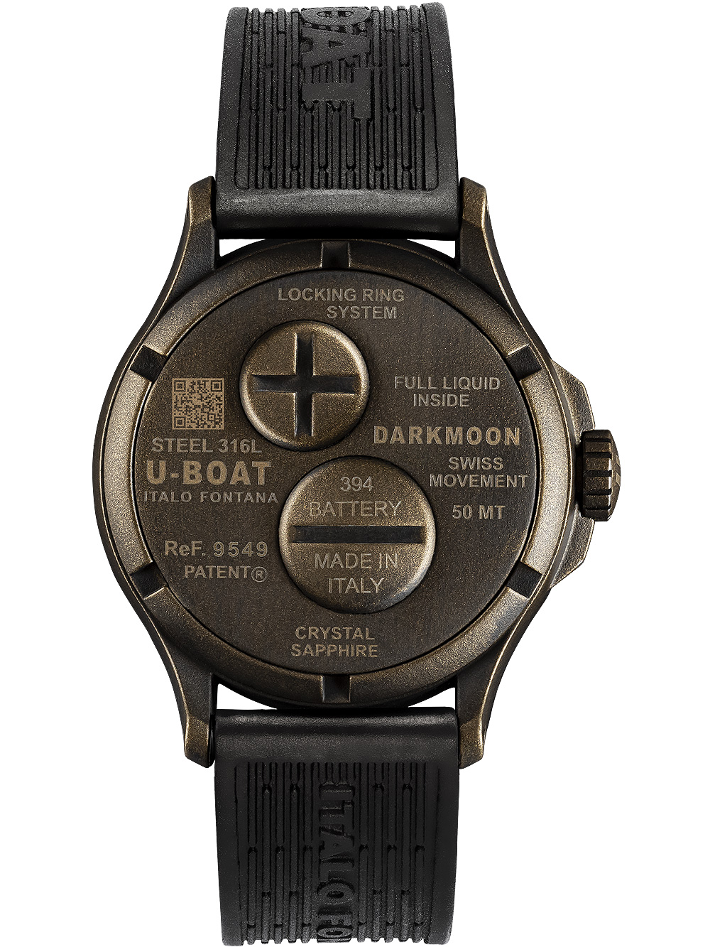 Het U-Boat 9549 Darkmoon bruin vintage herenhorloge is een modern en sportief polshorloge met een zwarte wijzerplaat, een mat bronzen kast en een caoutchouc band, voorzien van een Ronda quartz uurwerk en 5ATM waterbestendigheid.