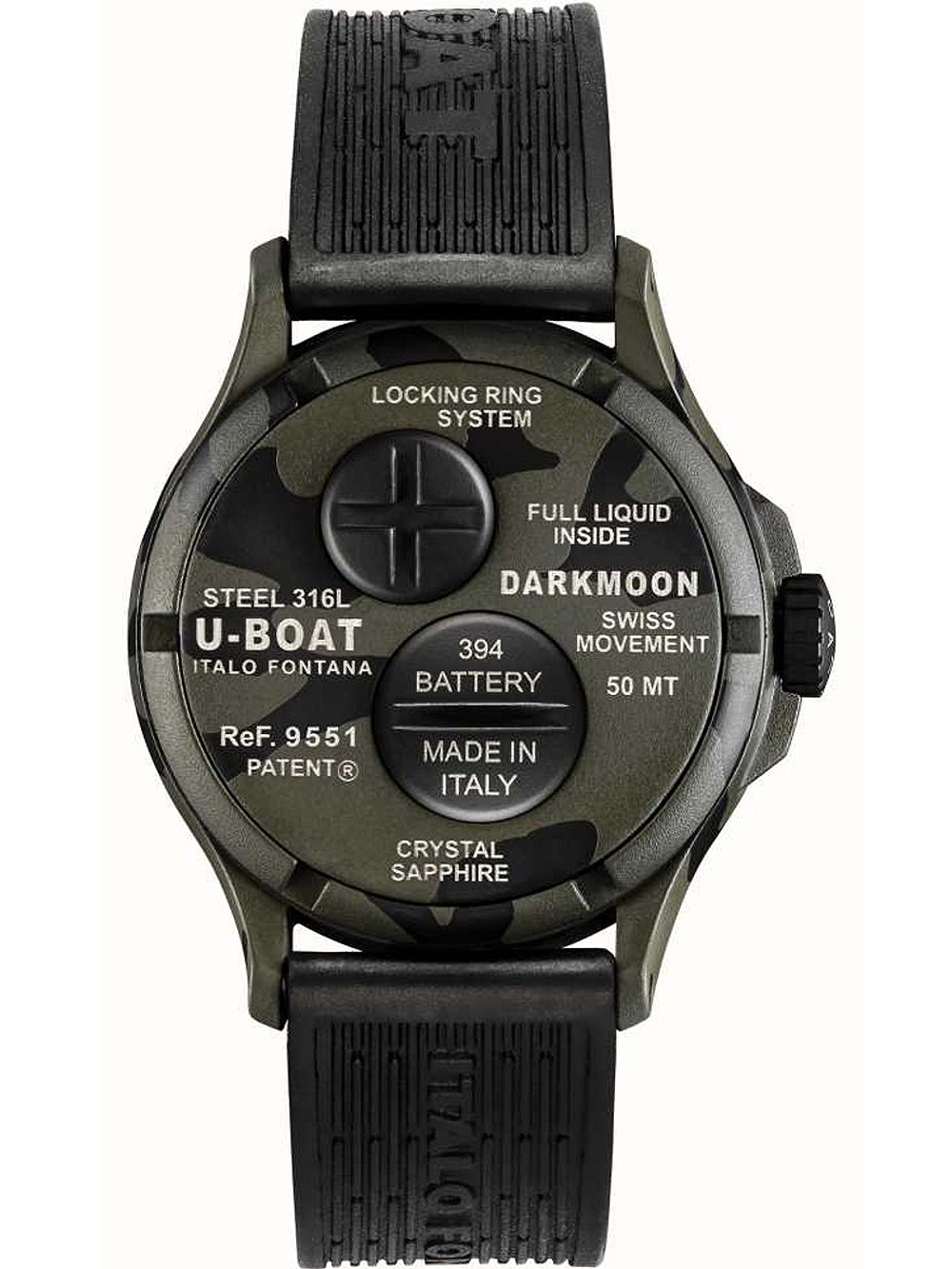 Ontdek de perfecte combinatie van stijl en functionaliteit met het U-Boat 9551 donkermaangrijs camouflage herenhorloge, met een matted zwarte wijzerplaat en anti-reflecterend saffierglas, Swiss Made en waterbestendig tot 5 ATM.