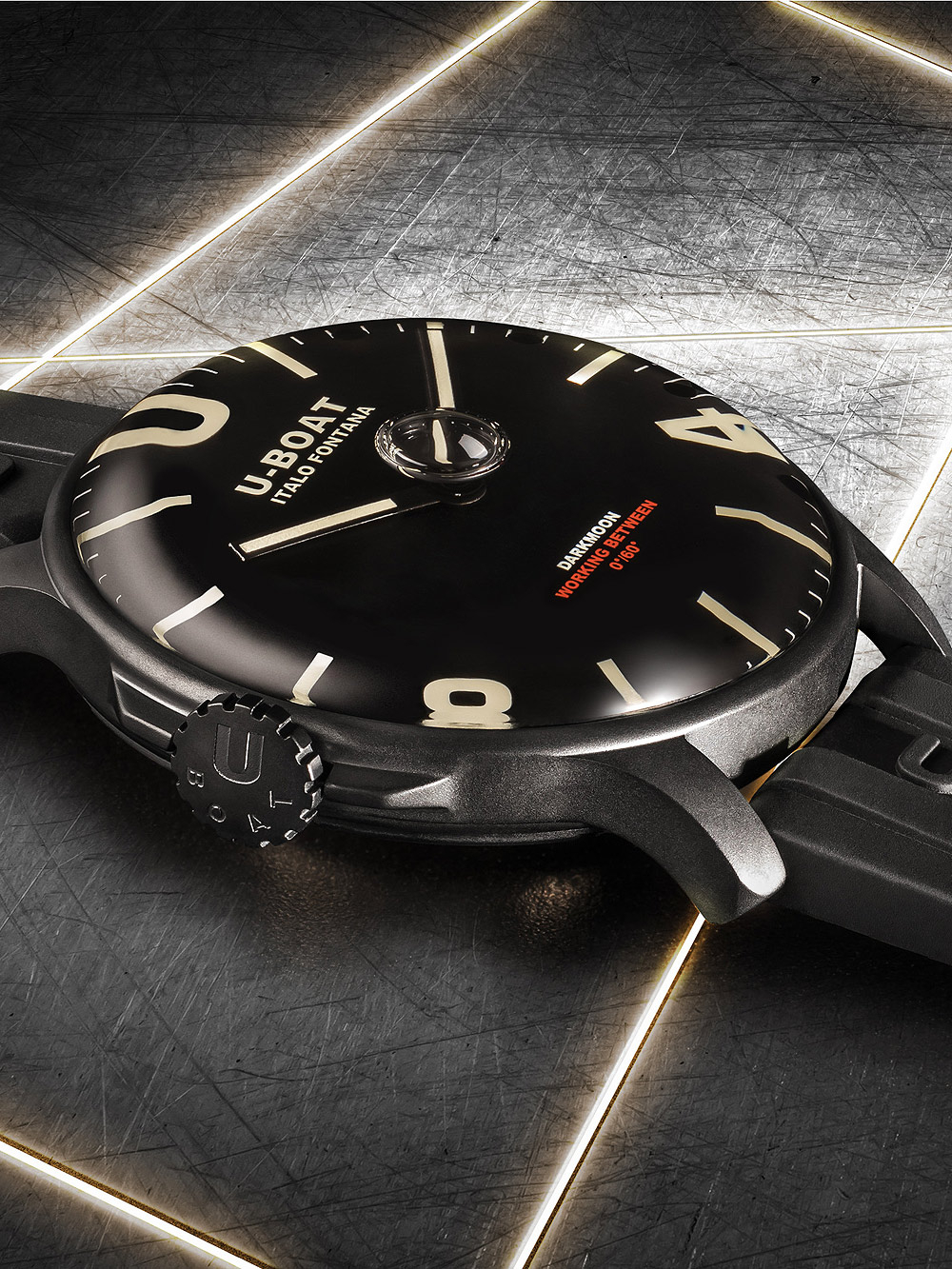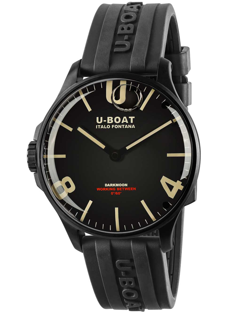 Omschrijving Met het stoere en moderne U-Boat 8464/C Darkmoon polshorloge ben je altijd bij de tijd, dankzij de Swiss Made batterij-aangedreven beweging en de handige functies voor uren en minuten, waterbestendig tot 5 ATM en voorzien van een anti-reflecterend saffierglas en een comfortabele zwarte caoutchouc band.