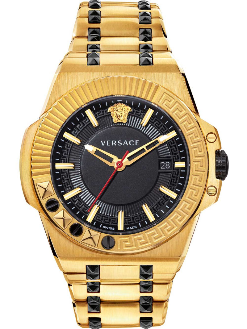 Het Versace VEDY00619 Chain Reaction herenhorloge is een modern polshorloge met een zwarte wijzerplaat, gouden details en een moderne roestvrijstalen band, voorzien van een Swiss Made quartz uurwerk en waterbestendig tot 5 ATM.
