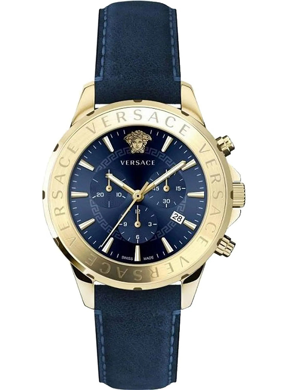 Omschrijving Ontdek de perfecte combinatie van elegantie en functionaliteit met het Versace VEV601423 handtekening chronograaf herenhorloge, voorzien van een blauwe wijzerplaat, gouden kast en een comfortabele blauwe leren band.