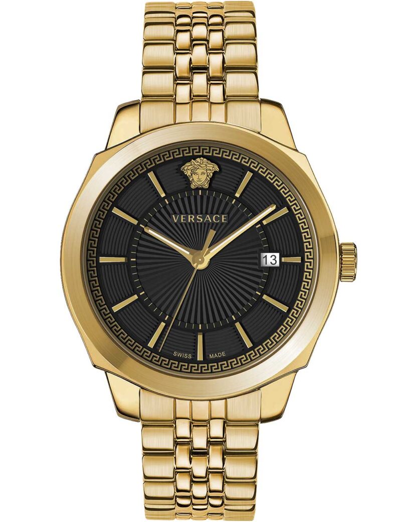 Omschrijving Het Versace VEV901723 Icoon Klassiek polshorloge is een stijlvolle en moderne accessoire voor heren, met een goudkleurige kast en band van roestvrij staal, een zwarte wijzerplaat en handige functies zoals datumweergave en verlichte wijzers.