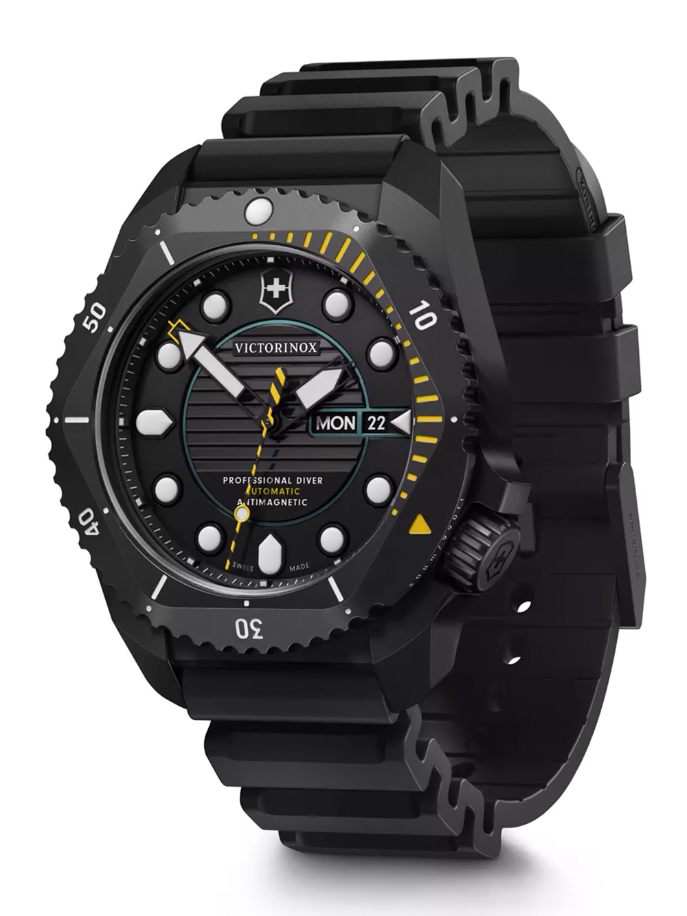 Het Victorinox 241997 herenhorloge Dive Pro is een sportief en stijlvol polshorloge gemaakt van titanium, met automatische beweging, een zwarte wijzerplaat en een waterbestendigheid van 30 ATM.