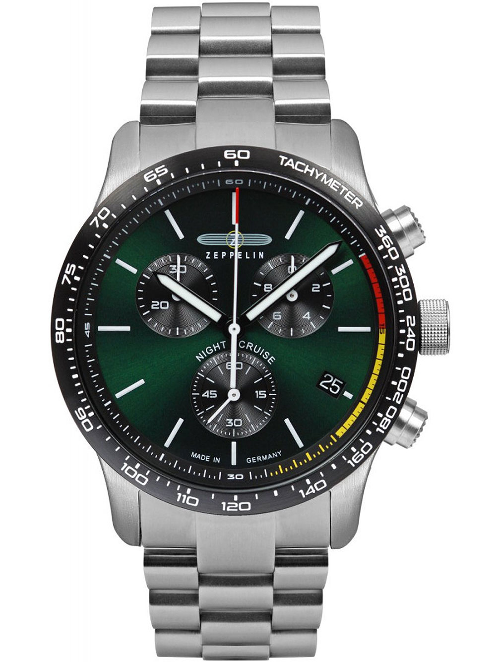Ontdek de tijdloze elegantie van het Zeppelin 7288M-4 Nachtvaart chronograaf herenhorloge met een groene wijzerplaat, 10ATM waterbestendigheid en een matted en polished afwerking.