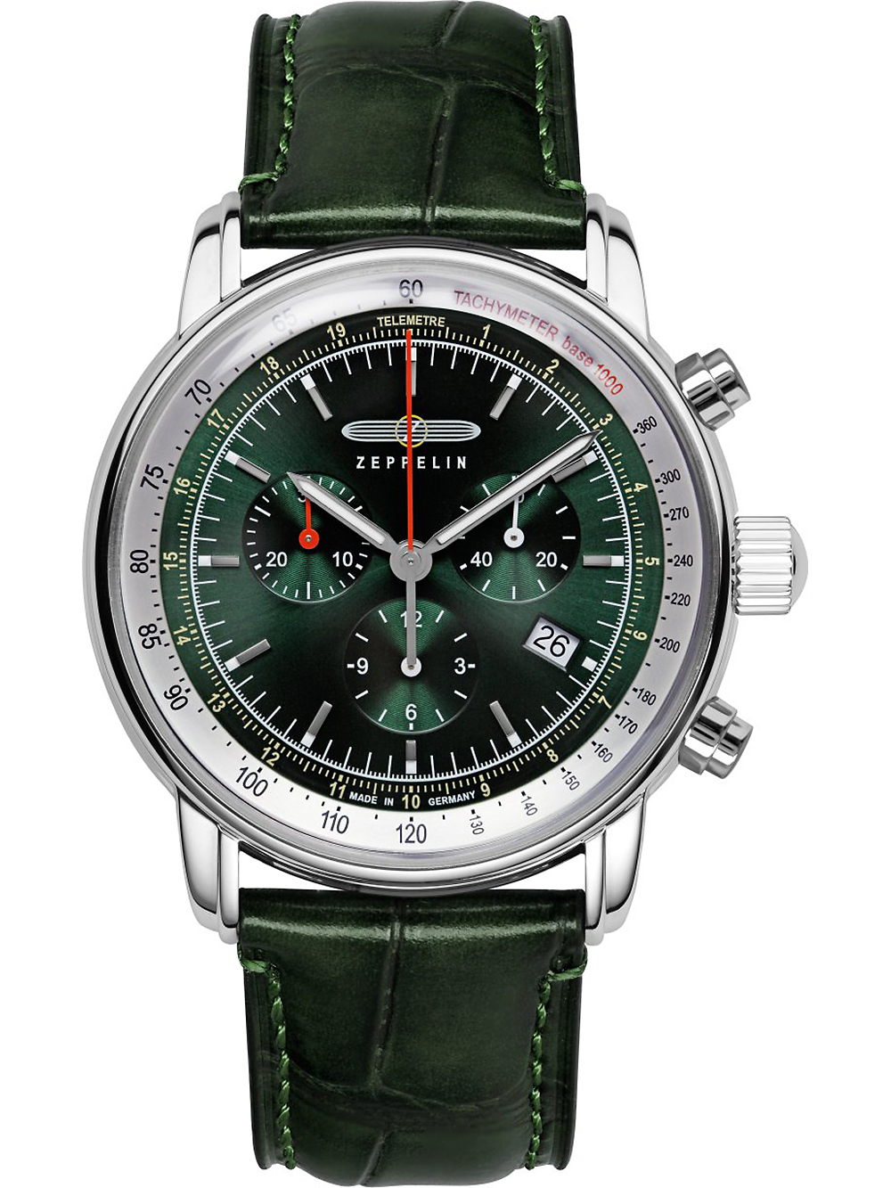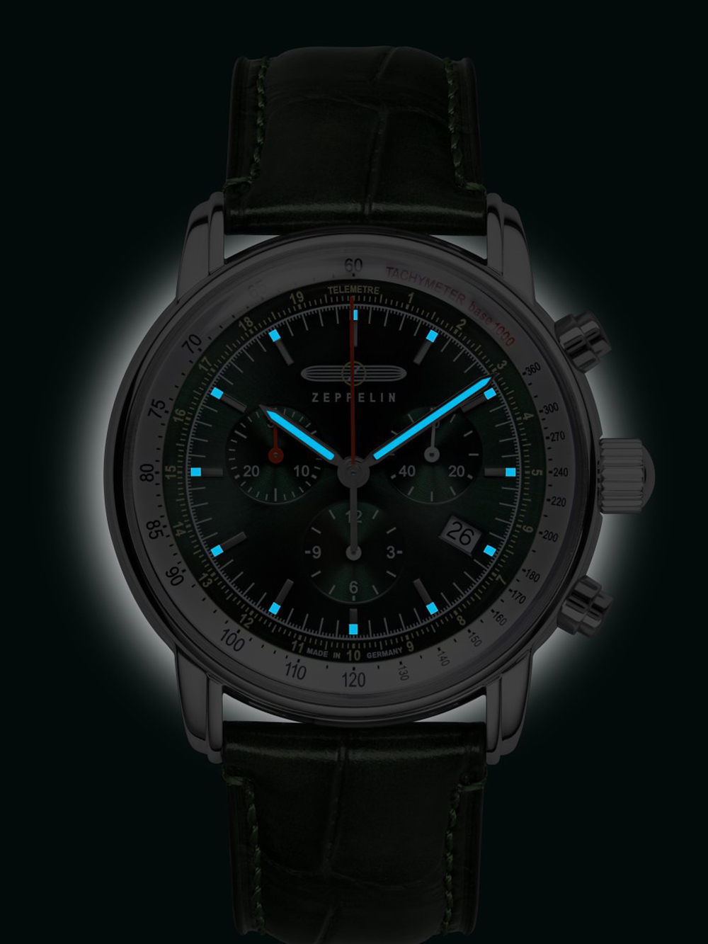 Omschrijving Met dit sportieve, Zwitserse Zeppelin polshorloge met groene wijzerplaat en marine chronograaf functies ben je altijd op tijd en stijlvol bij elke gelegenheid, inclusief een kalfsleren band en 5 ATM waterbestendigheid.
